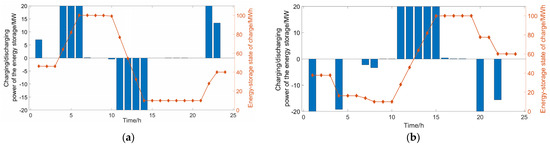 Figure 13 shows the charging/discharging power and state-of-charge (SOC) curves for the energy storage system when participating in low-carbon demand response under the two typical scenarios. As can be seen from the figure, in the “electricity–carbon peak alignment” scenario, the energy storage system primarily charges during periods of abundant renewable energy output and low system carbon intensity, such as 1:00–7:00 and 22:00–23:00. This facilitates the accommodation of surplus green electricity, achieving a temporal shift and storage of low-carbon energy. Conversely, during high-load and high-carbon-intensity periods like 11:00–14:00, the energy storage system discharges in response to the high carbon price signal. This action serves two purposes: it compensates for the power deficit caused by insufficient renewable energy output and peak load, and it effectively reduces the need to dispatch high-carbon marginal units, significantly alleviating the operational and carbon emission pressures on the system. In the “electricity–carbon peak misalignment” scenario, the charging and discharging behaviour of the energy storage system follows the same carbon signal response logic: charging is concentrated during the 11:00–15:00 period, characterised by high renewable energy output and low carbon intensity, while discharging occurs during high-carbon-intensity periods, such as 0:00–5:00 and 20:00–23:00. The consistent charging and discharging behaviour of the energy storage system in both scenarios demonstrates that it effectively achieves a spatiotemporal shift of carbon energy through a “low-carbon charge, high-carbon discharge” model, thereby enhancing the low-carbon performance and economic efficiency of the system’s operation.