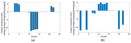 Figure 14a and Figure 14b illustrate the carbon emissions corresponding to the charging and discharging of energy storage systems under two typical scenarios, respectively. In these figures, a positive value on the y-axis represents the charging of the energy storage system, which corresponds to releasing carbon, while a negative value signifies discharging in order to supply power to the load, corresponding to absorbing carbon. This visualisation allows for a direct observation of the changes in carbon emission intensity during different charge–discharge states of the energy storage system, thereby validating the effectiveness of the “carbon carrying capacity” concept in characterising its carbon-related behaviour.