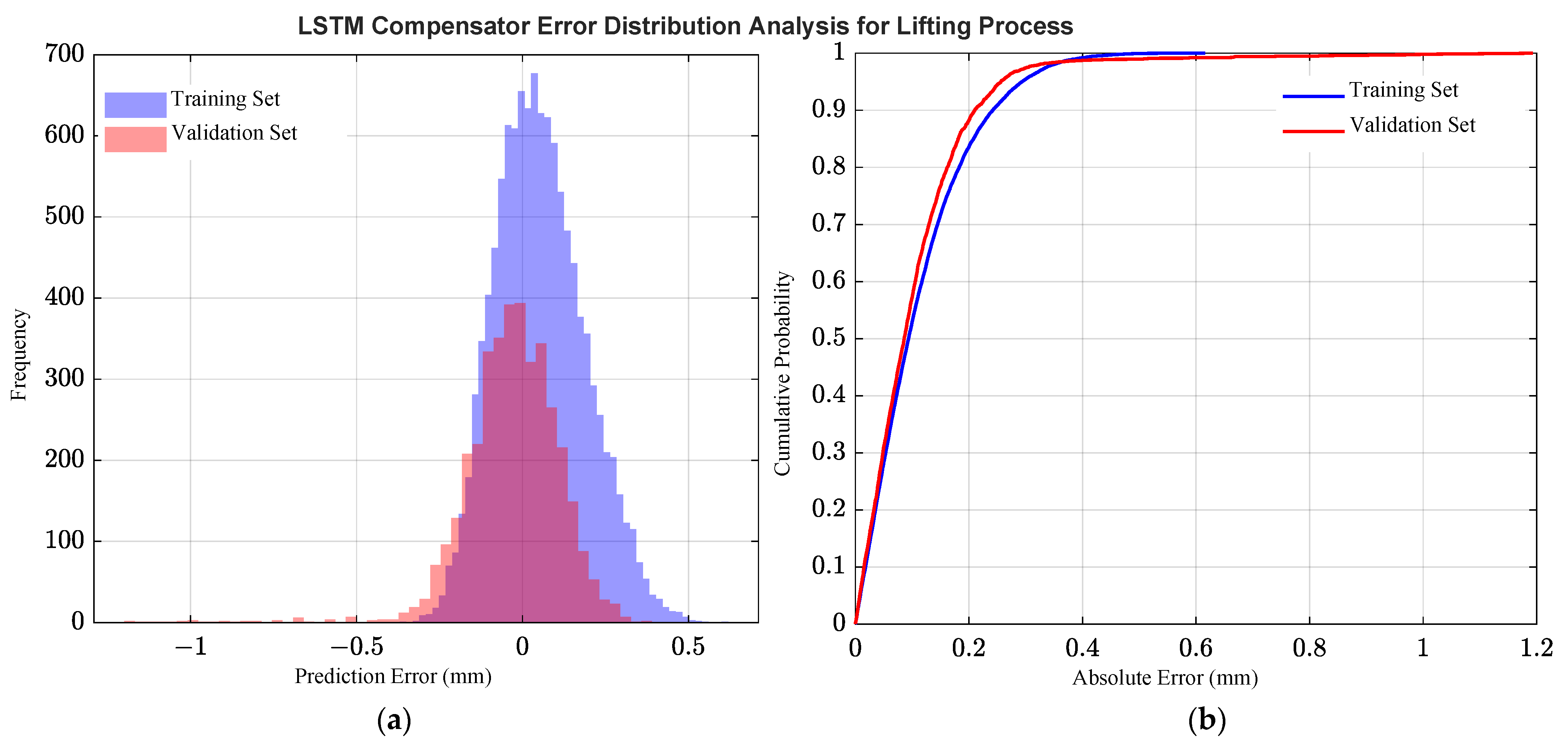- LSTM Neural Network Compensator: After obtaining the optimal parameter for the benchmark transfer function model, the 16 datasets were further divided into 12 training sets and 4 validation sets. As described in Section 2.2.3, the input sequences for the LSTM were generated using a sliding window method with a window length of . The first 50 samples of each dataset served as historical data, resulting in a total of training samples for updating the network weights during training. Similarly, validation samples were generated from the validation set to monitor the training process, prevent overfitting, and determine the optimal LSTM parameter .