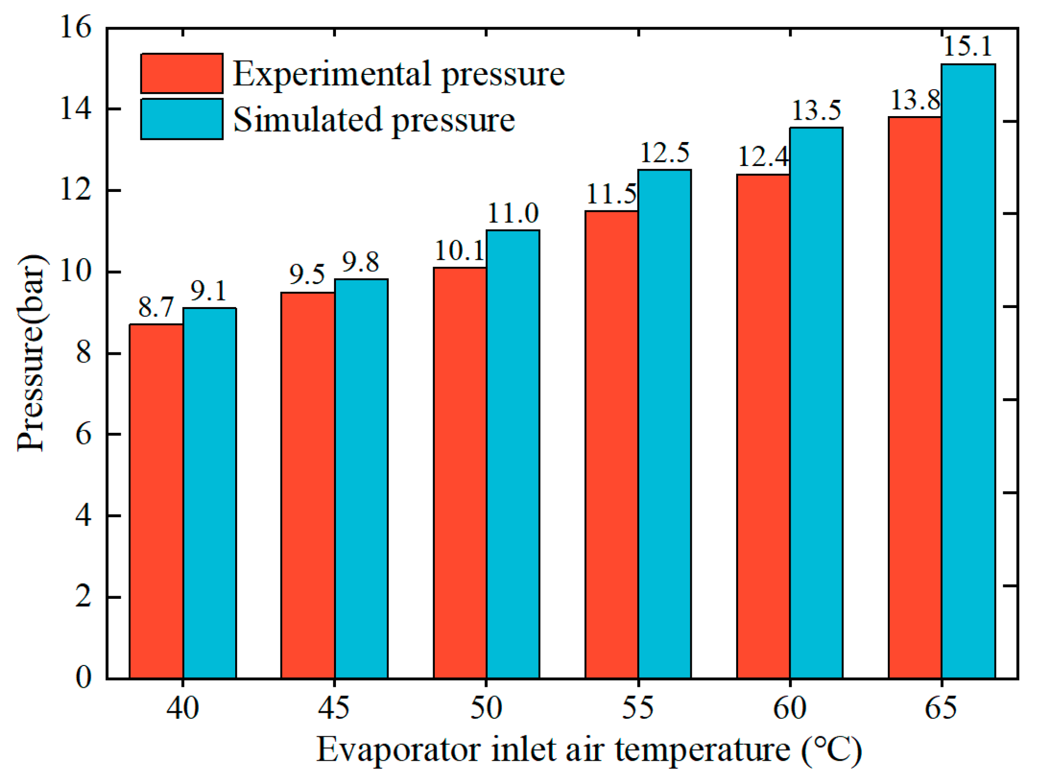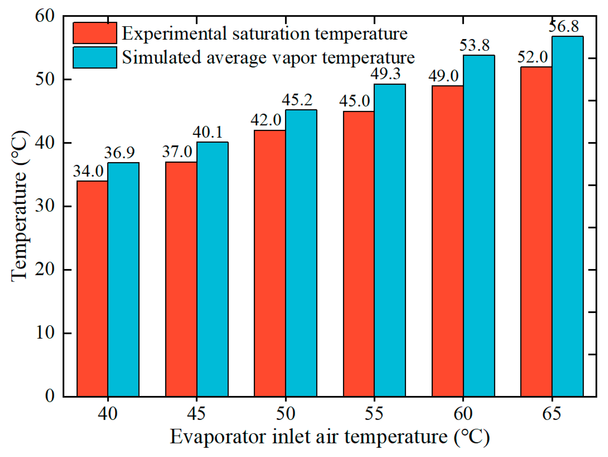 - The airflow distribution (such as air velocity, air capacity, and air temperature) was assumed to be uniform across the evaporator and condenser surfaces. Assuming a uniform airflow distribution over the evaporator and condenser surfaces simplifies the boundary conditions and ensures convergence of the coupled fluid–thermal field. This approximation is acceptable when the airflow is confined and well mixed, as the bulk flow largely determines convective heat transfer. Nevertheless, it suppresses local variations such as turbulence intensity, hot spots, and recirculation, which could smooth the temperature and velocity gradients, thereby limiting the precision of local heat transfer coefficient predictions.