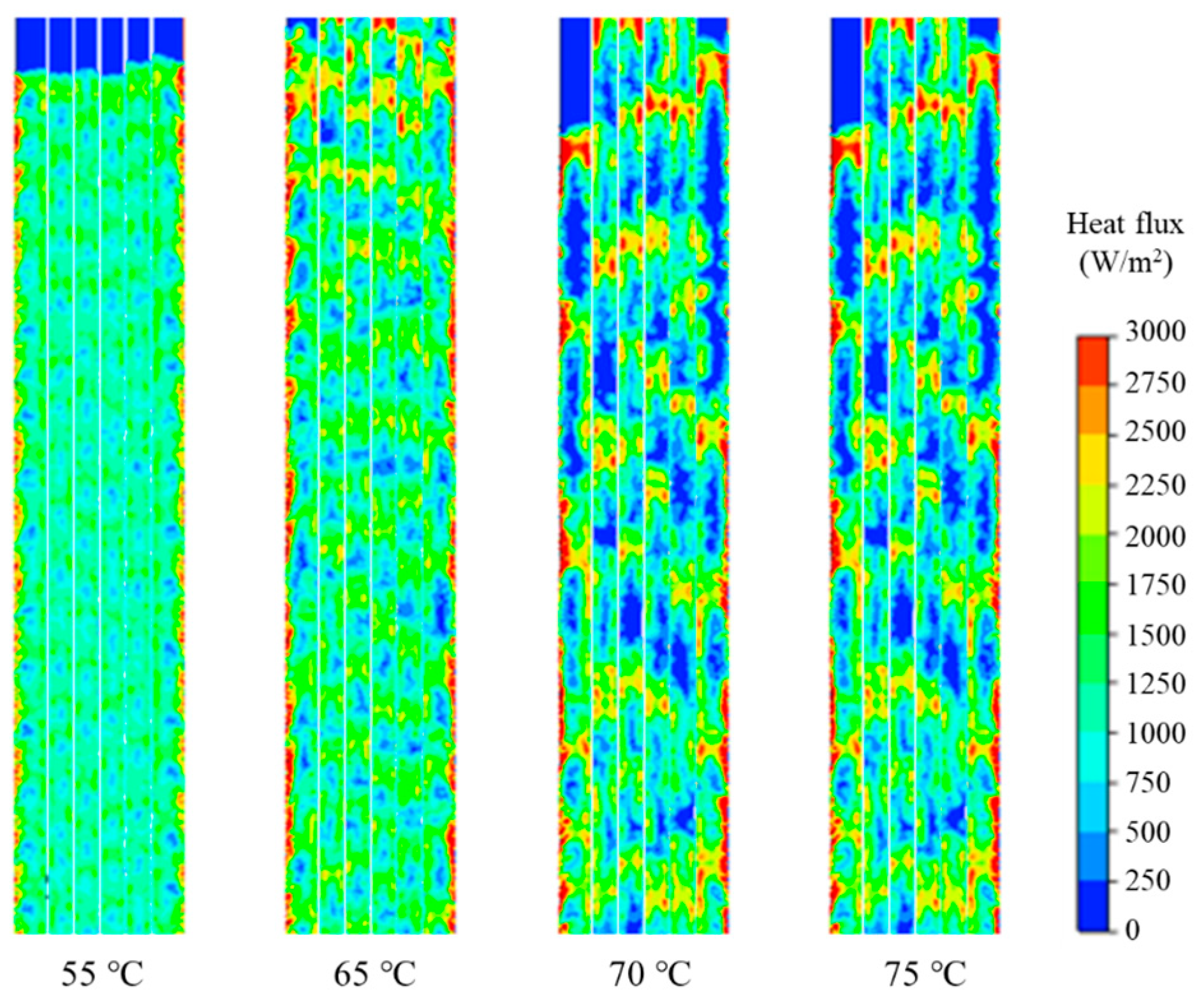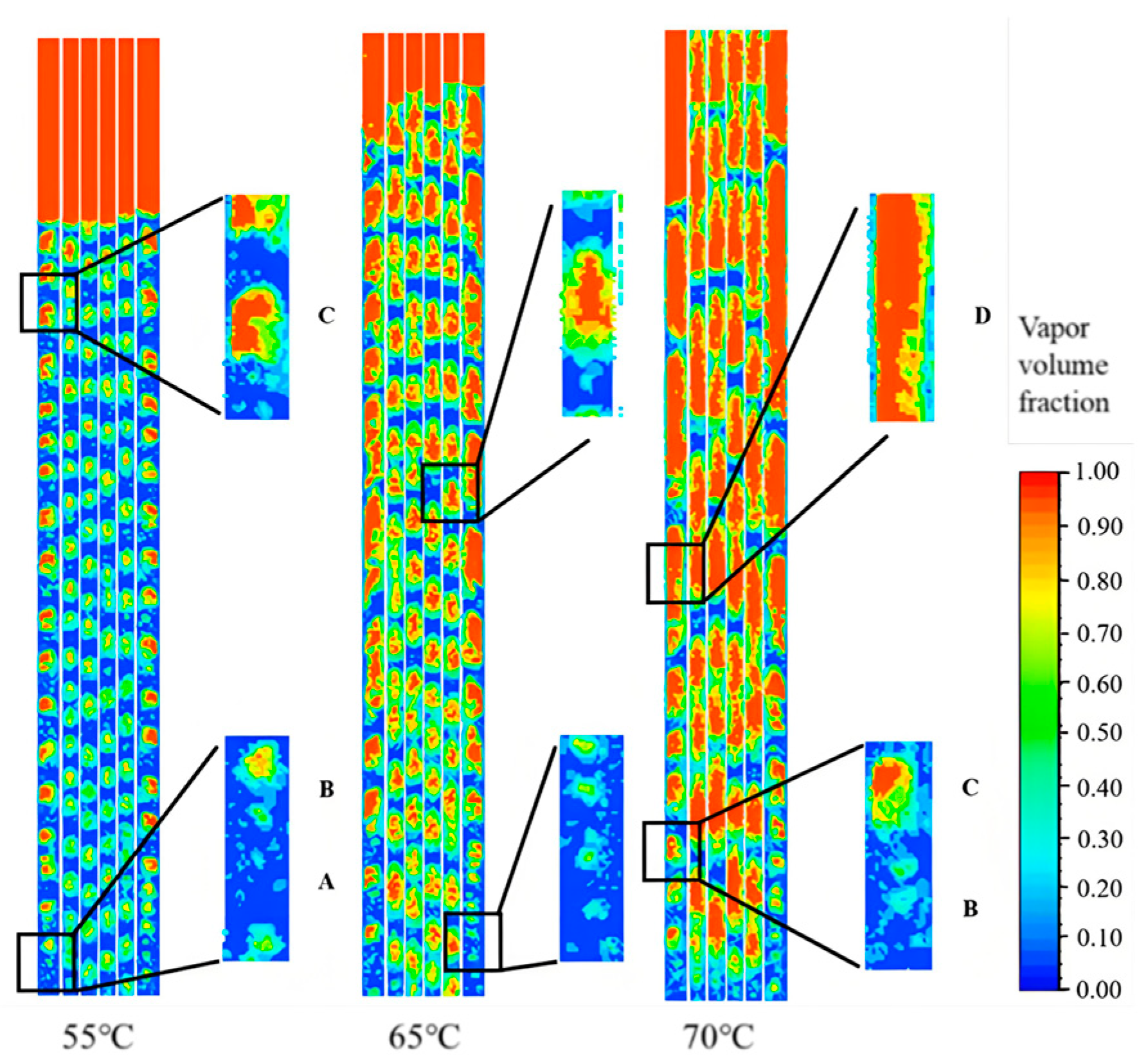 - The thermophysical properties (such as density, specific heat, viscosity, and thermal conductivity) of R134a remained unchanged within the operational temperature range from 25 to 100 °C. Treating the thermophysical properties of R134a as constant throughout the operating temperature range is a computationally convenient assumption but physically restrictive. Since the working fluid undergoes phase change under a wide temperature span, its density, viscosity, and thermal conductivity vary noticeably with temperature and pressure. Keeping them constant stabilizes the solver but sacrifices thermodynamic fidelity, potentially misrepresenting vapor–liquid distribution and overall heat transfer characteristics. This assumption is therefore more suitable for qualitative trend analysis than for accurate quantitative prediction.