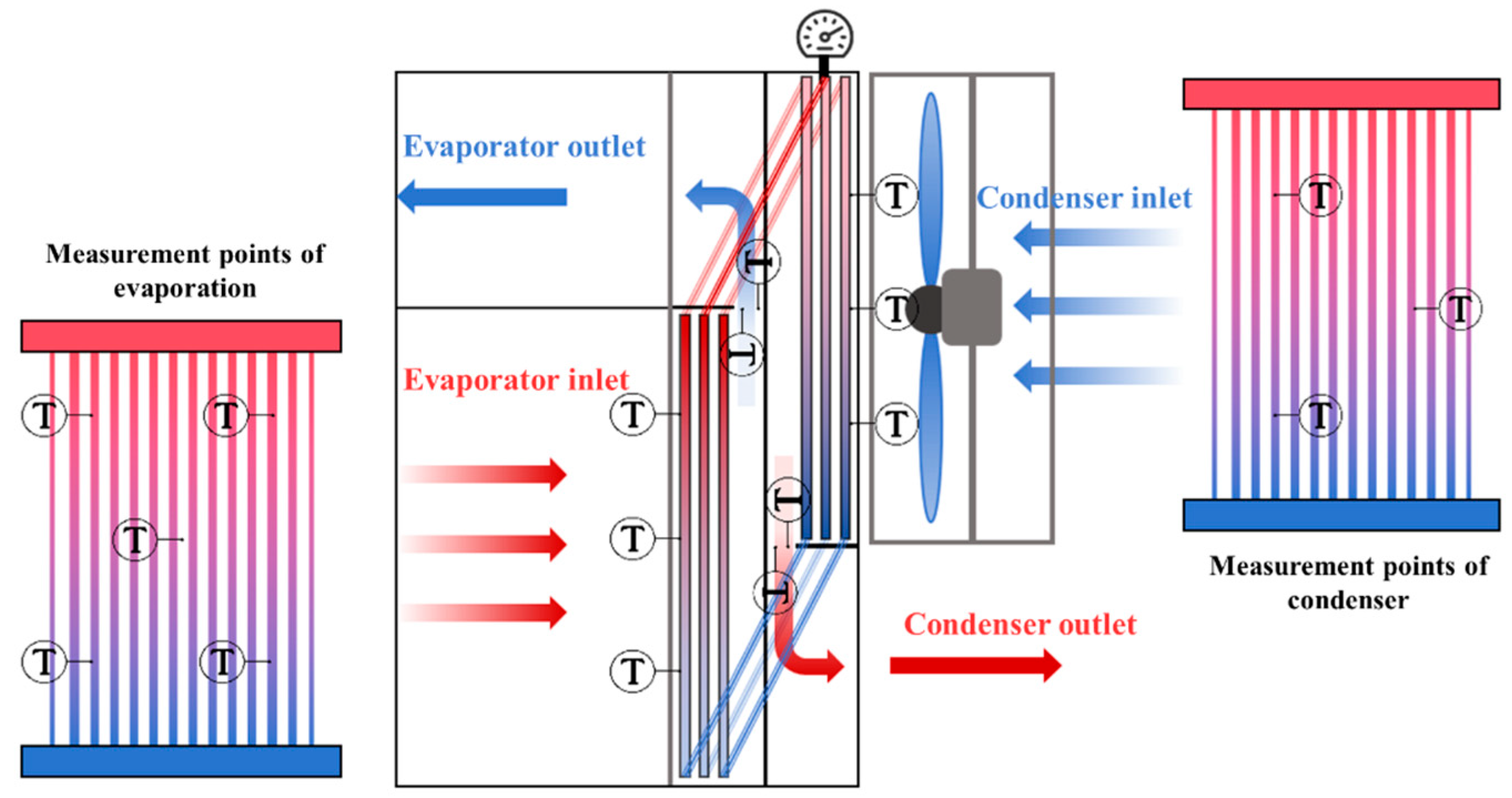 - Liu, S.; Ma, G.; Li, X.; Xu, S. Experimental investigation and application potential analysis of vapor compression refrigeration integrated mechanically-driven loop heat pipe for data centers cooling. Appl. Therm. Eng. 2025, 259, 124958. [Google Scholar] [CrossRef]