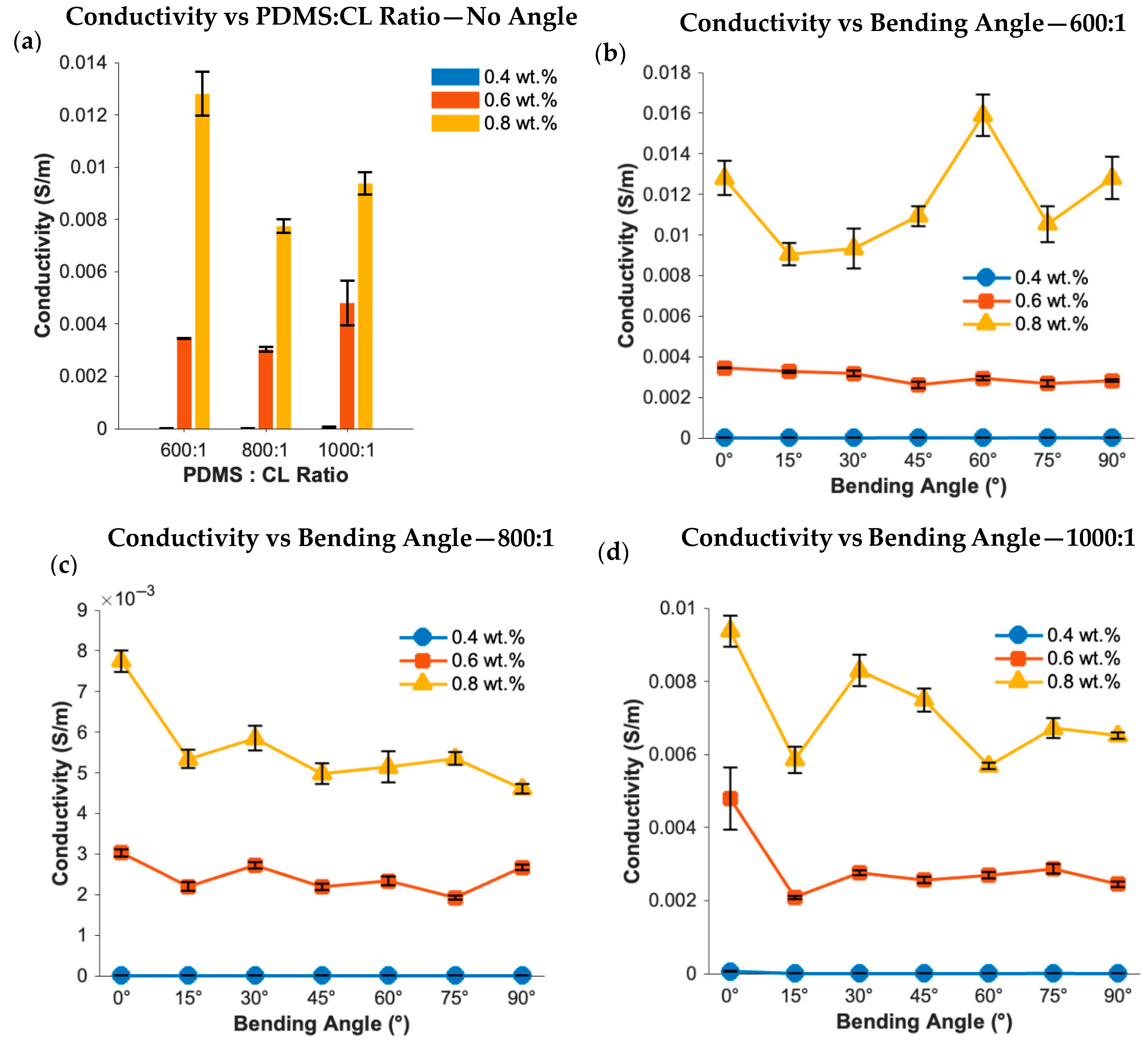 Figure 2a shows the conductivity result of samples tested on a flat surface. As seen, for all formulations with different molar ratios between PDMS and crosslinker, conductivity increased as CNT loading increased from 0.4 to 0.8 wt.%. This trend is expected as a higher CNT content can facilitate more interconnected conductive pathways throughout the elastomer matrix.