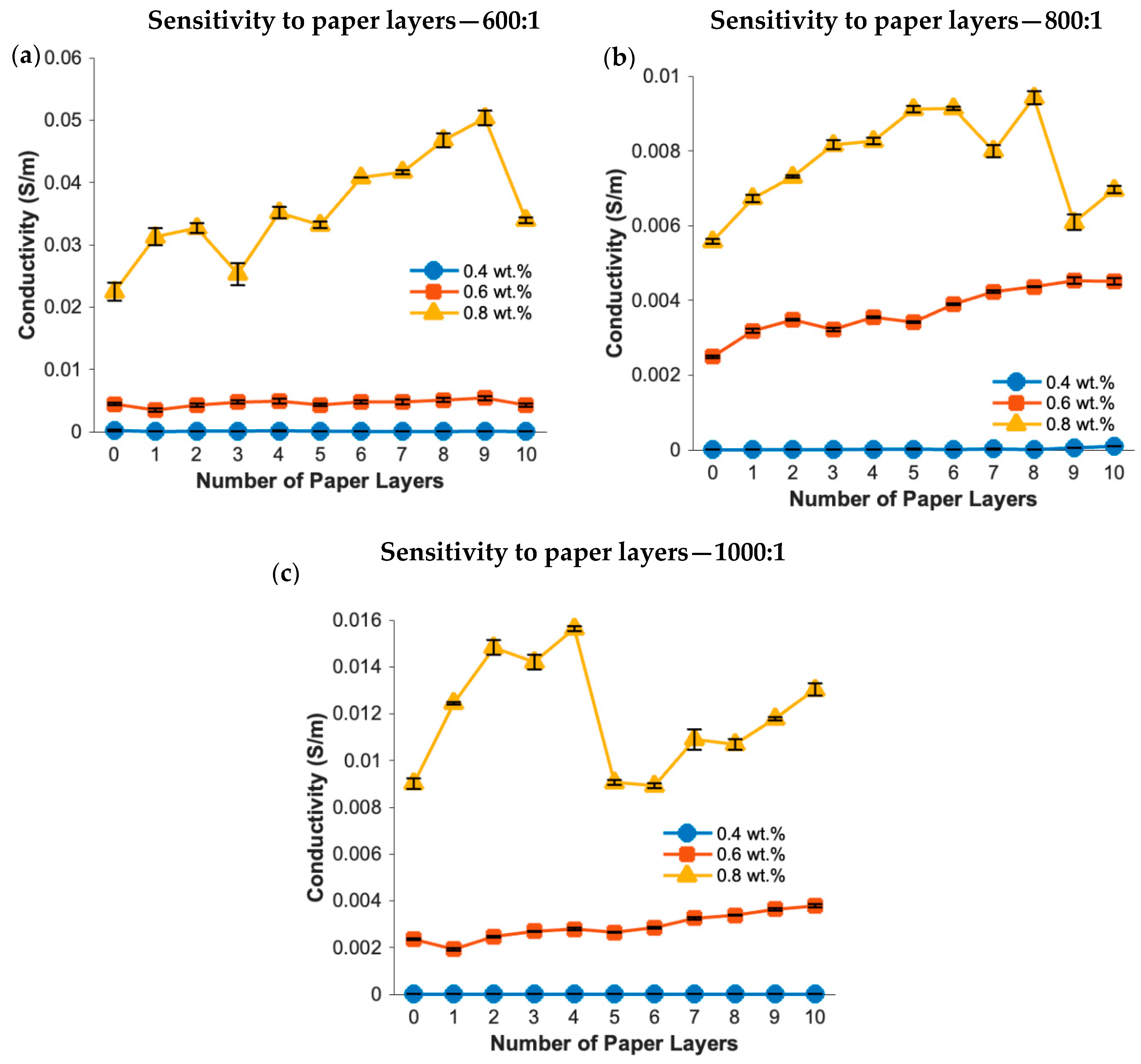 Figure 3a, the 0.8 wt.% CNT composite exhibited the highest conductivity (>0.02 S/m) with noticeable fluctuations as the number of paper layers increased. This behavior indicates that dense conductive networks at higher filler loadings experience local compression of CNT junctions under pressure with temporary disruption or reorganization due to uneven stress disruption within the relatively stiff matrix. In contrast the 0.6 wt.% composite displayed significantly lower but more consistent conductivity (~0.005 S/m) across all layers, reflecting a more stable percolation network. The 0.4 wt.% sample showed conductivities below 0.4 × 10
