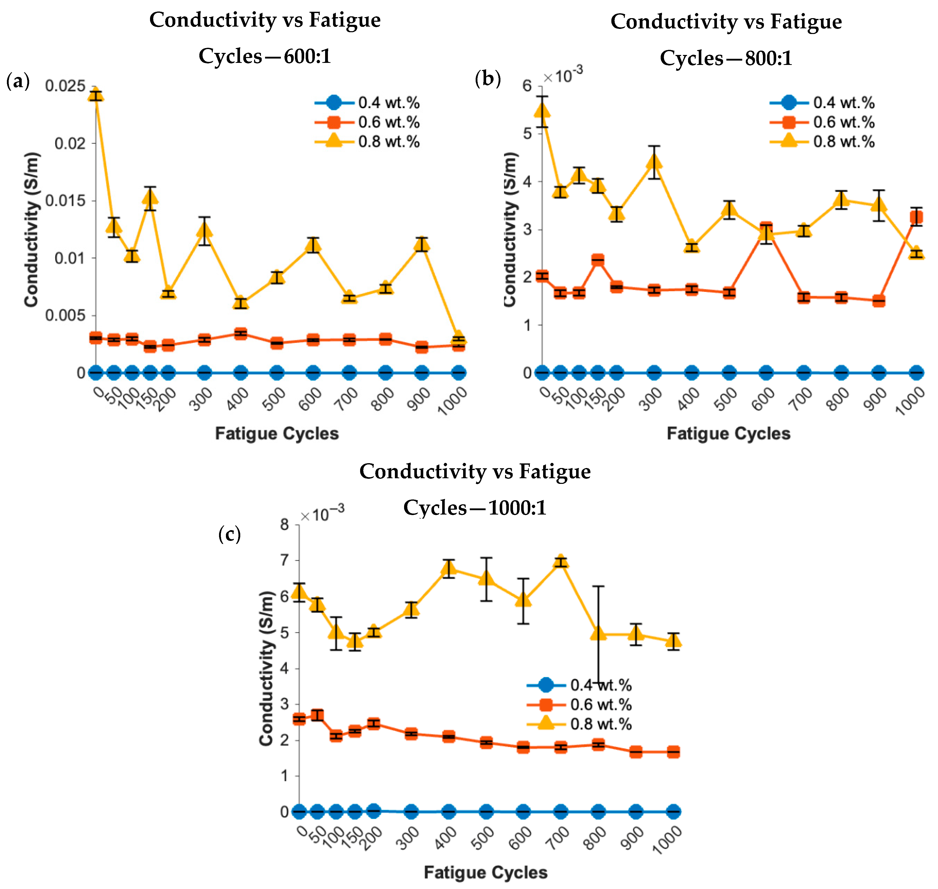 Supplementary Figure S12), conductivity increased with applied loads, with the 0.4 wt.% sample showing the steepest rise. Fatigue testing (