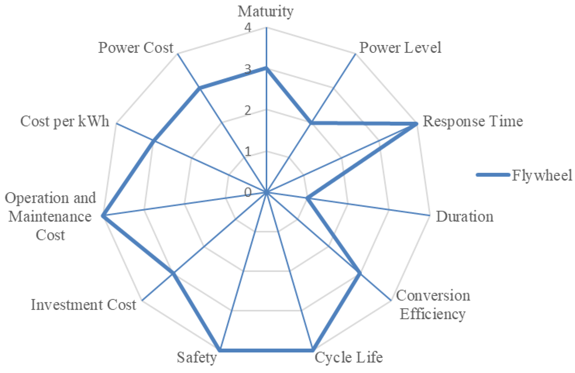 Flywheel Energy Storage: Flywheel energy storage ranks second in the comprehensive score (3.32) and stands out in power requirements, response time, and safety. The advantage of flywheel energy storage is its ability to provide large amounts of power in a short time and its quick response time, allowing rapid adjustment of power output to respond to fast load changes. Although its duration is shorter, its efficient energy storage and release characteristics make it highly suitable for short-term, high-power frequency regulation scenarios, such as those required in nuclear power frequency regulation.