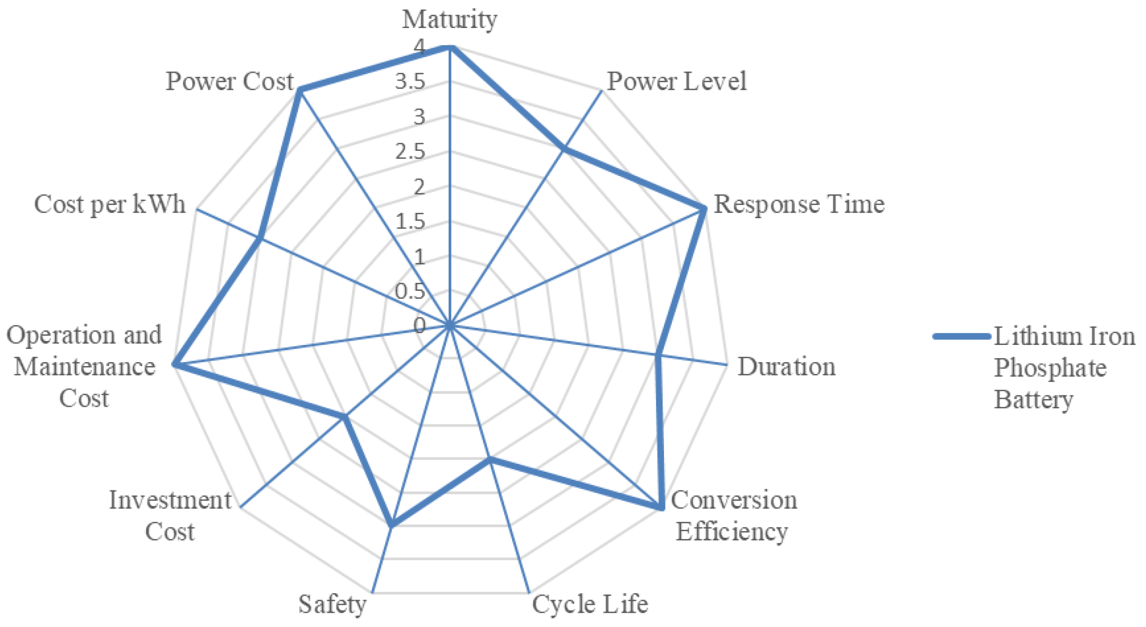 The flow battery obtained the highest comprehensive score (3.54 points) in this evaluation system. Although its economic indicators such as cost and efficiency are relatively average, this result reflects the comprehensive consideration of multiple factors such as technical performance, safety, and policy support in the multidimensional evaluation framework. Specifically, flow batteries have received high ratings in technical indicators due to their long cycle life, fast response capability, and high safety level. These technological advantages are particularly important in extreme operating conditions such as nuclear power frequency regulation. In addition, compared to other energy storage technologies, flow batteries have good environmental adaptability and lower lifecycle costs, which is compensated to a certain extent in the comprehensive economic evaluation. Although the initial investment cost of flow batteries is higher and the energy conversion efficiency is slightly lower than that of lithium-ion batteries, their longer service life and lower maintenance requirements help reduce long-term operating costs. Technical and safety indicators account for a significant share in weight allocation, enabling flow batteries to demonstrate their core competitiveness in the overall score. Overall, the high comprehensive score of flow batteries accurately reflects their comprehensive value for nuclear power frequency regulation applications, indicating that flow batteries have significant application advantages in the pursuit of system safety, stability, and long-term economy.