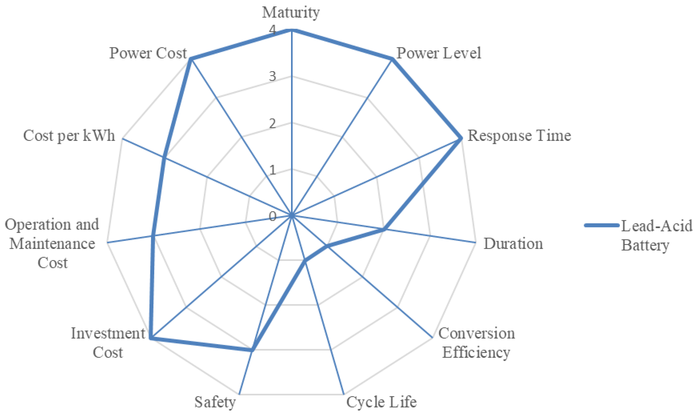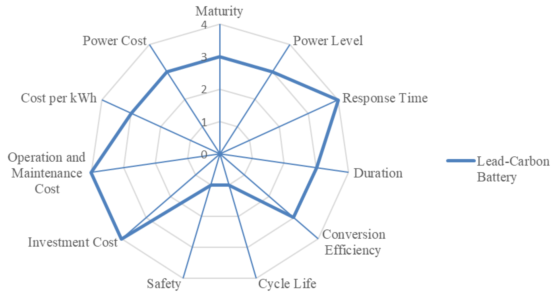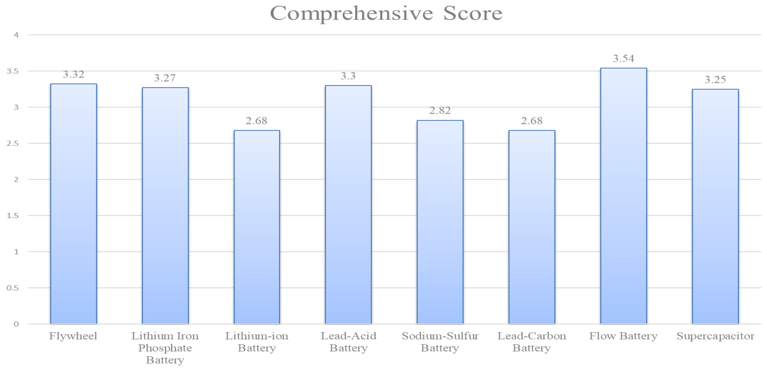 Lead-Acid Batteries: Lead-acid batteries have a comprehensive score of 3.30, showing high maturity and response time. However, their safety is not as good as that of flow batteries and flywheels, and their conversion efficiency is low, making them less recommended for selection.