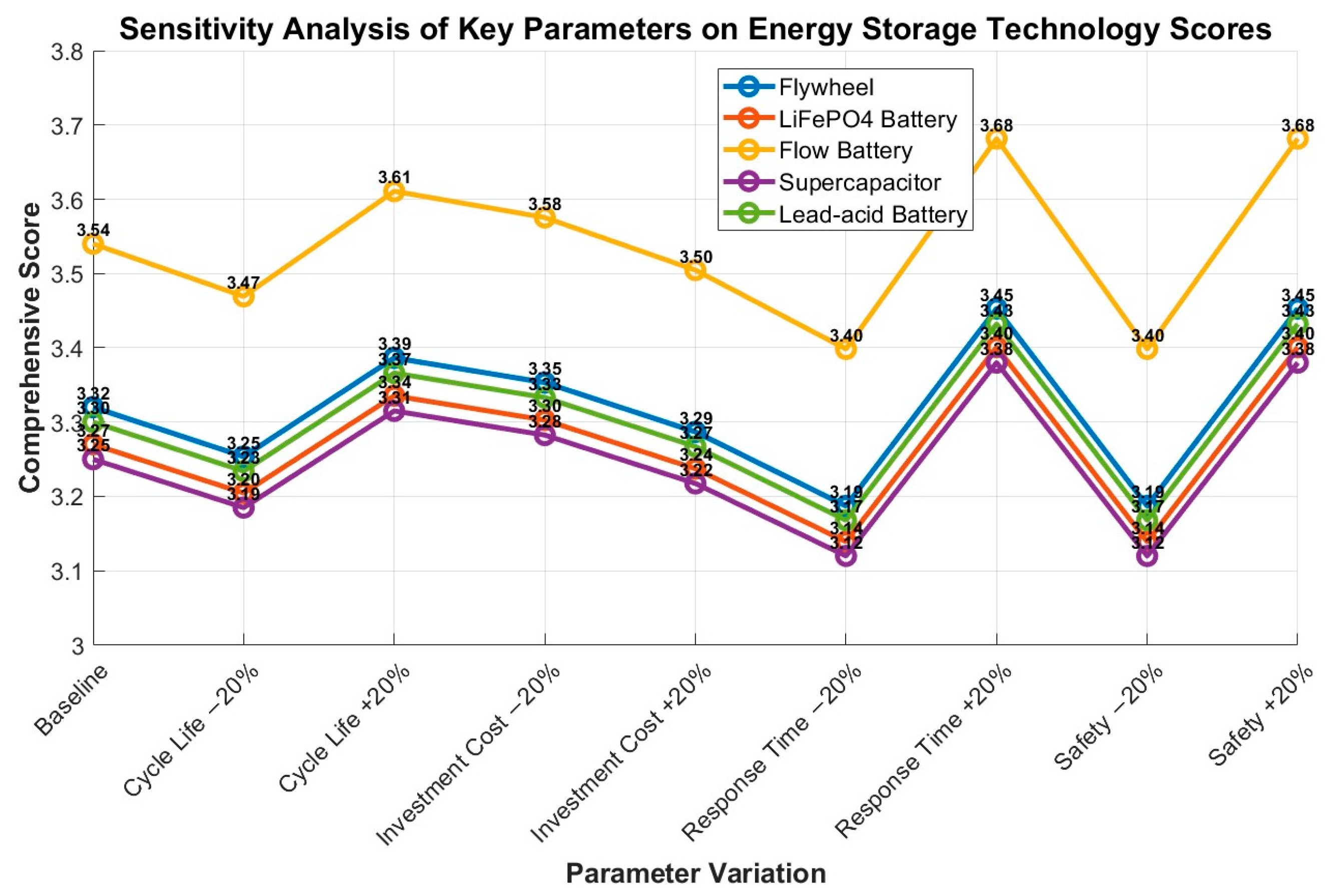 A single factor sensitivity analysis of ±20% was conducted on key parameters such as cycle life, investment cost, operation and maintenance cost, and response time. The results showed that the comprehensive scores of various energy storage technologies were controlled within ±4% under the influence of parameter disturbances, further verifying the robustness of the constructed evaluation model. The weight sensitivity analysis reveals that the adjustment of technical indicator weights has a significant impact on the overall rating and ranking, especially for flywheel energy storage, where the rating increase reaches about 2.7% when the technical weight is increased. This reflects the reasonable allocation of technical performance weights in the model. The stability of the overall ranking structure indicates that the model can still maintain the reliability of the evaluation results when facing uncertainty in parameters and weights.