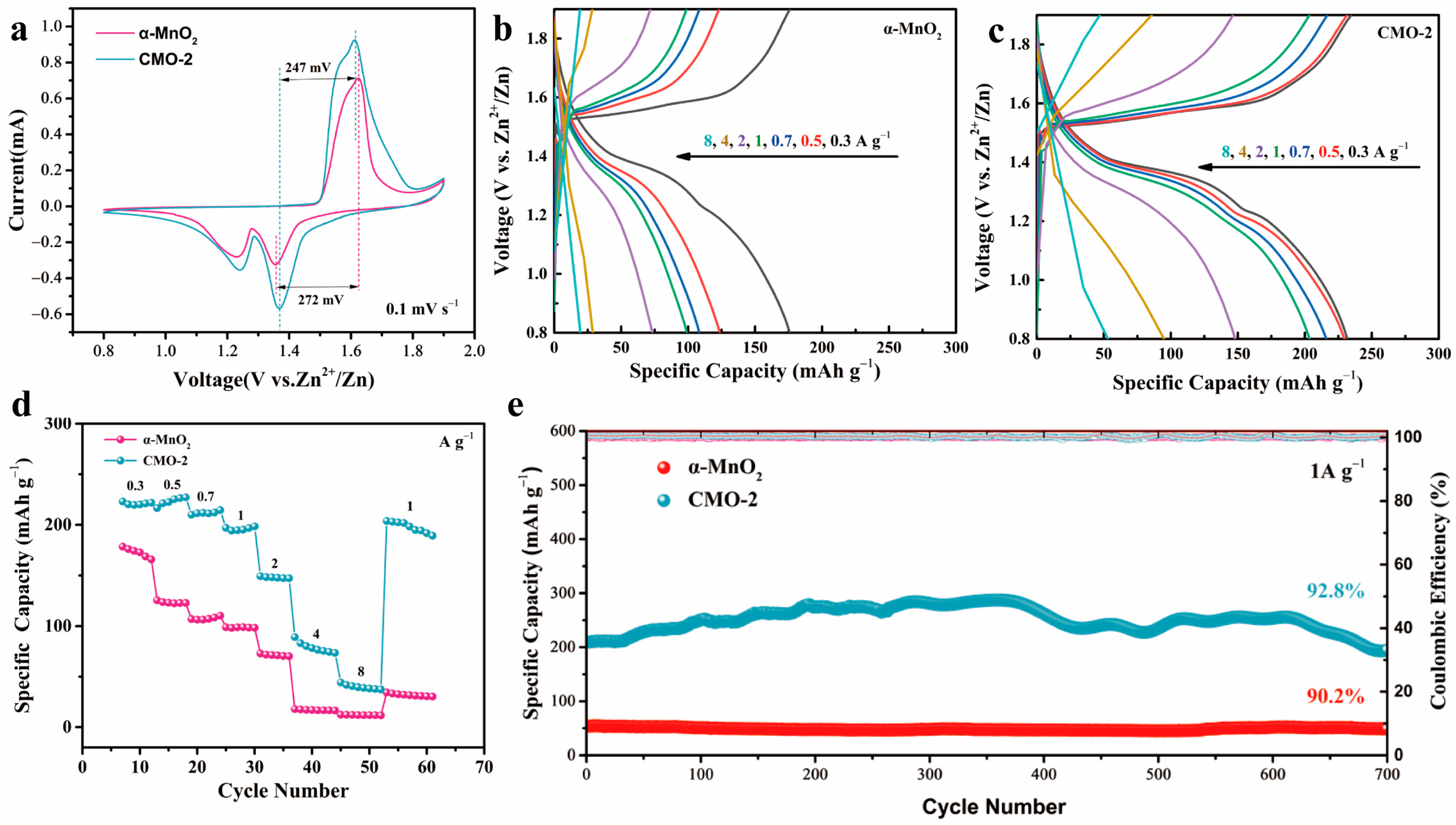 - Hu, X.; Liao, Y.; Wu, M.; Zheng, W.; Long, M.; Chen, L. Mesoporous copper-doped δ-MnO2 superstructures to enable high-performance aqueous zinc-ion batteries. J. Colloid Interface Sci. 2024, 674, 297–305. [Google Scholar] [CrossRef]