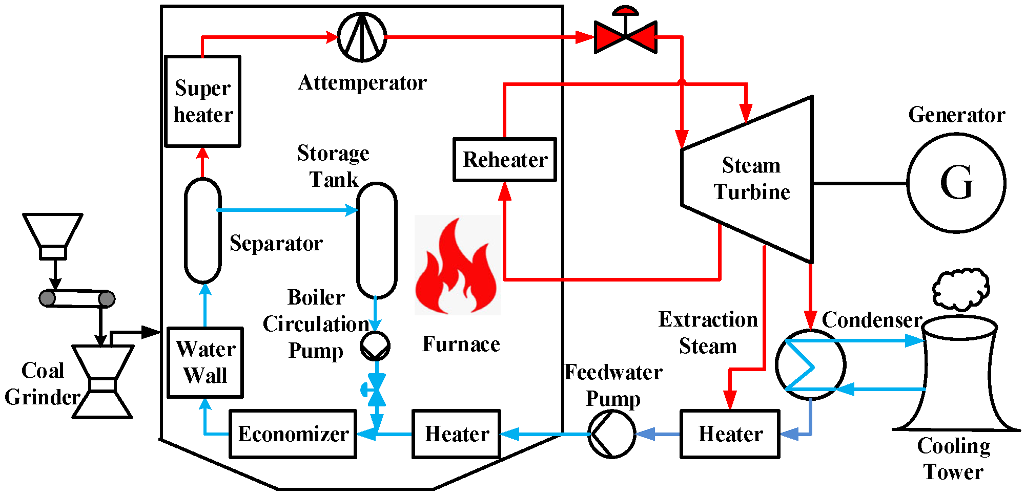 - Gao, Z.; Lv, J.H.; Qv, X.F.; Ge, H. Research on Modeling of a Fully Loaded Ultra-supercritical Boiler-Turbine Coordination System. Power Equip. 2021, 35, 201–206. (In Chinese) [Google Scholar] [CrossRef]