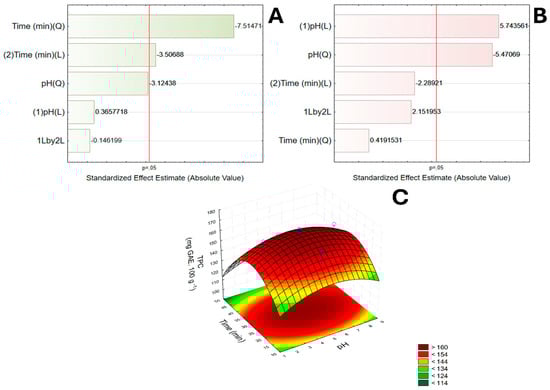 The linear and quadratic effects were analyzed using the Pareto diagram (Figure 1A,B). Only pH was significant and positive for betalain extraction (Figure 1A). However, the model test was not significant for this variable; therefore, it was not possible to predict any behavior in relation to the variables, so the response surface was not generated.