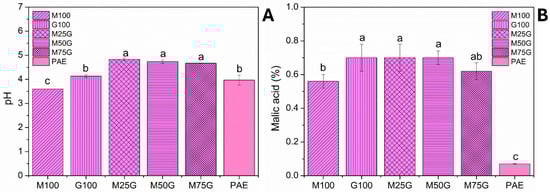 A significant difference between the optimized aqueous pitaya peel extract PAE and freeze-dried pitaya particles was observed regarding pH and malic acid content (Figure 2A,B). G100, M100 and PAE showed the lowest pH values (p < 0.05) among treatments. Also, freeze-dried particles had a substantially higher malic acid concentration compared to liquid PAE (p < 0.05). This is probably due to acid concentration caused by freeze-drying. When the malic acid content was evaluated, lower results (p < 0.05) were observed when MD only (not blended) was used as the wall material, with an upper tendency when GA was added in increasing ratios (Figure 2B). Similar trend was observed for TPC and betalain content, suggesting that GA enabled a denser, more protective barrier against the degradation of polar bioactive molecules [].