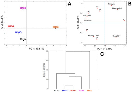 Principal component analysis and cluster analysis representations of results for freeze-dried pitaya particles. (A) PC1 × PC2 scores coordinate system; (B) PC1 × PC2 loadings showing the correlations between physical, physicochemical and chemical parameters considered in this study for freeze-dried pitaya particles; (C) Cluster analysis. Legend: TPC = total phenolic content; AA = antioxidant activity; M100 = freeze-dried particles obtained from PAE with MD only; G100 = freeze-dried particles obtained from PAE with GA only; M25G = freeze-dried particles obtained from PAE with 25% (w/w) MD and 75% (w/w) GA; M50G = freeze-dried particles obtained from PAE with 50% (w/w) MD and 50% (w/w) GA; M75G = freeze-dried particles obtained from PAE with 75% (w/w) MD and 25% (w/w) GA.