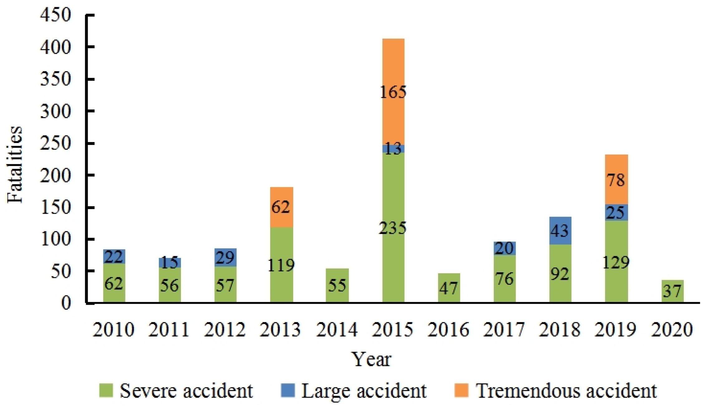 - Liu, T.M.; Zhong, M.H.; Xing, J.J. Industrial accidents: Challenges for China’s economic and social development. Saf. Sci. 2005, 43, 503–522. [Google Scholar] [CrossRef]