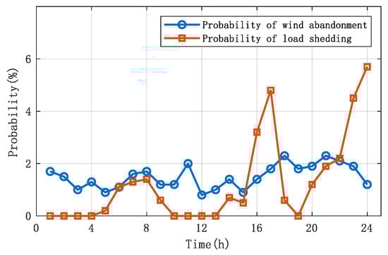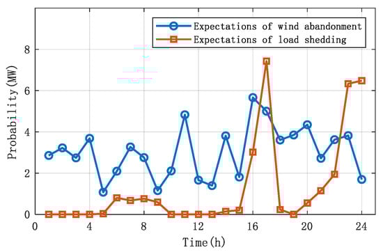 The wind speed and load are sampled 1000 times under each time node, respectively, and the passive wind abandonment and load cutting probabilities and expectations of the system for 24 h are calculated as shown in Figure 7 and Figure 8.