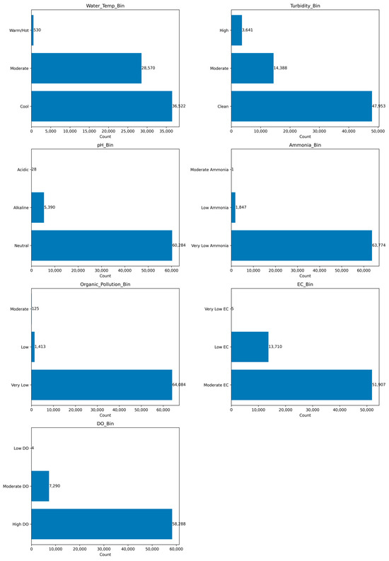 An exploratory analysis of the water quality data revealed that some parameters met Japan’s environmental quality standards for water pollution (Figure 2) [44]. To improve the BN’s interpretability, all variables were discretized into meaningful categorical bins. This was defined based on government thresholds [45] (Table 6).