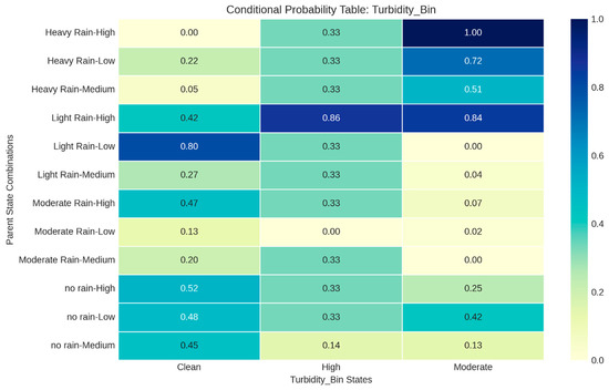 These results suggest that a static Bayesian Network (BN) framework sufficiently captures the primary probabilistic dependencies within the Kiso River system. While a dynamic BN could represent delayed turbidity responses more explicitly, the marginal improvement in predictive accuracy does not justify the increased computational complexity. Thus, the static BN provides a parsimonious yet robust representation of short-term hydrometeorological–water quality interactions