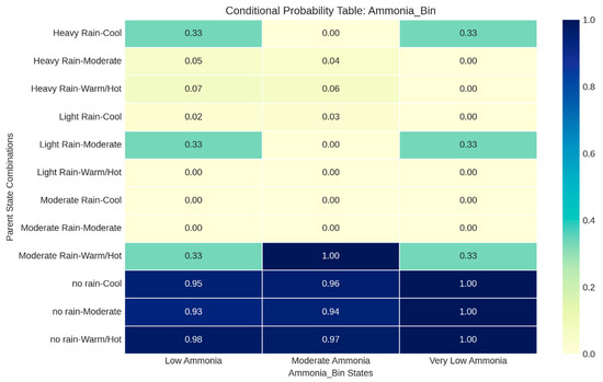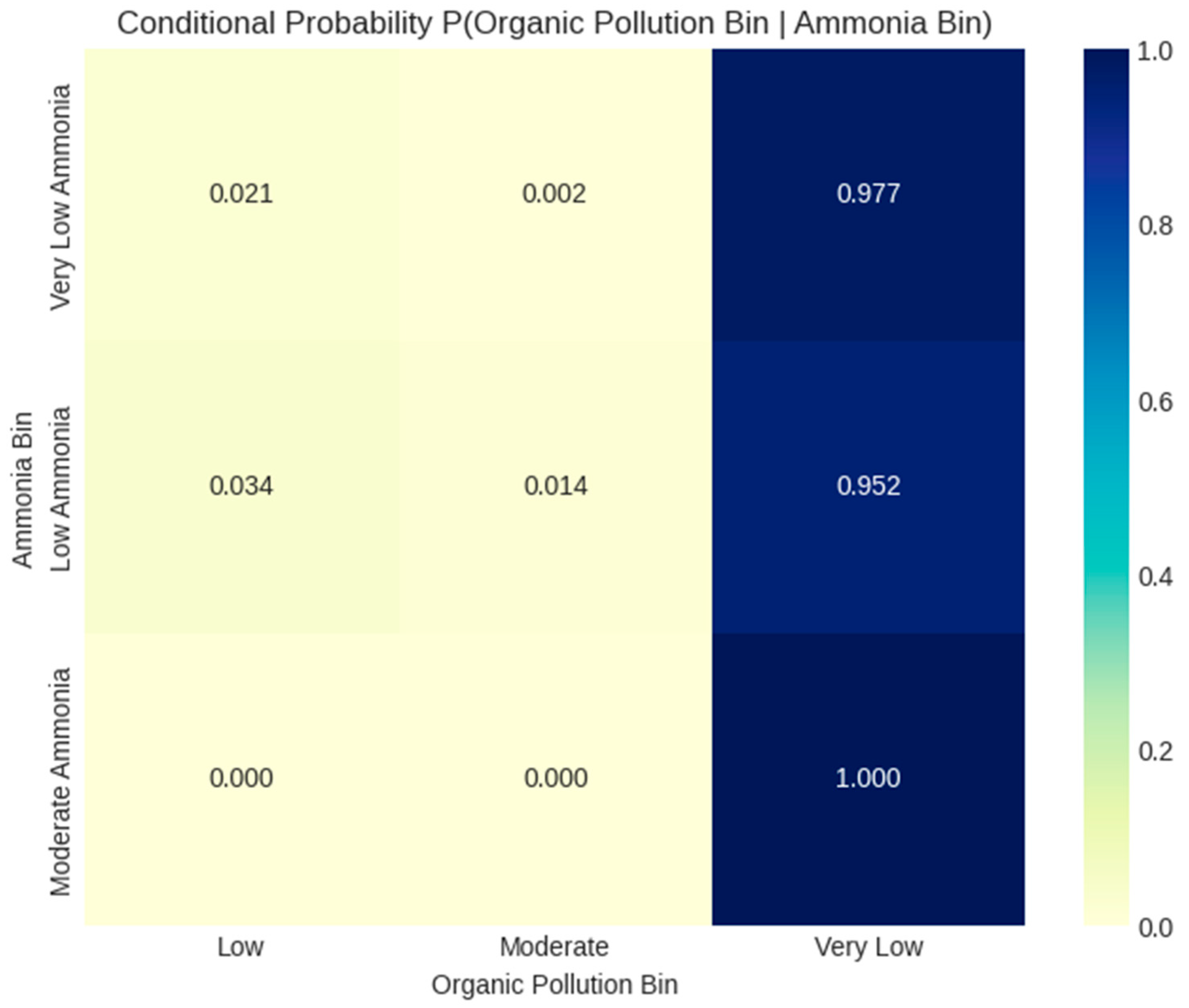 Ammonia concentrations exhibited a strong dependence on both rainfall and temperature regimes (Figure 6). Dry and warm conditions were associated with low ammonia levels, reflecting reduced surface runoff and enhanced nitrification efficiency under higher temperatures. Conversely, cool and wet periods led to elevated ammonia levels, primarily due to increased runoff transporting nitrogen-rich compounds from agricultural fields and urban surfaces into the river system [64,65]. Low temperatures further inhibited microbial nitrification processes, reducing the conversion of ammonia to nitrate and resulting in its accumulation within the water column [66]. Conditional probabilities also revealed a strong association between ammonia and organic pollution, reflecting that microbial decomposition of nitrogen-rich compounds contributes to particulate organic matter in the river. Deviations at moderate ammonia levels highlight the influence of discretization and environmental thresholds, demonstrating the limitations of binning strategies in probabilistic modeling.