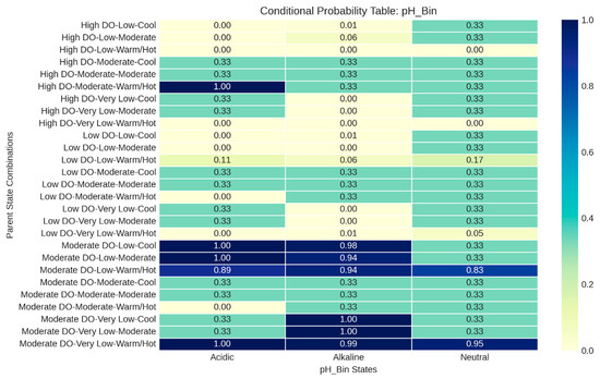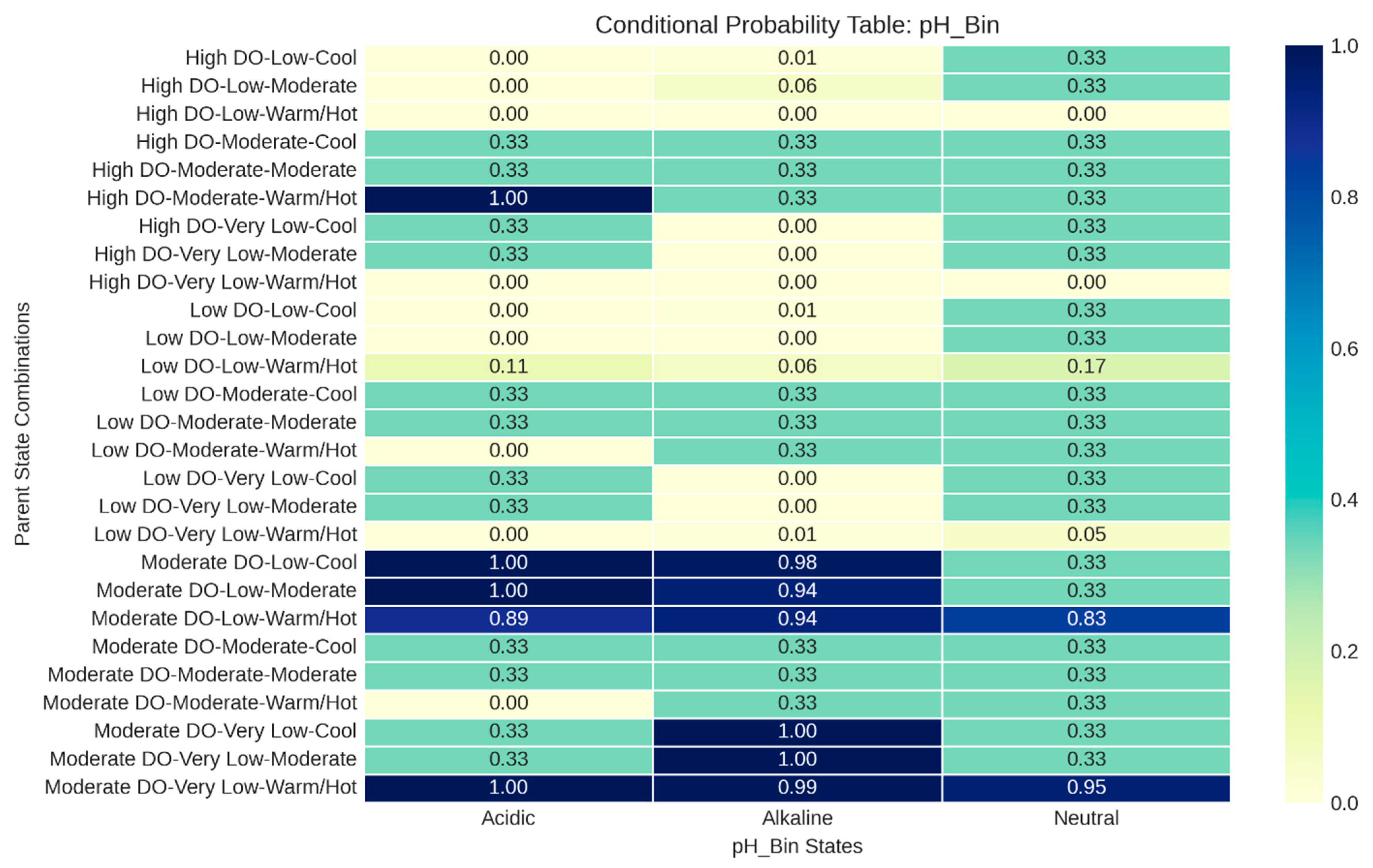 The conditional probability analysis stresses the role of biological oxygen demand (BOD) and organic decomposition in determining pH values (Figure 7). The results revealed a neutral pH when DO was high and BOD was low, while moderate DO and increased BOD shifted the pH to acidic, neutral, and alkaline levels. These shifts in pH correlated with the release of organic acids during decomposition [67]. Temperature exerted a secondary but notable effect on pH. Warm water tends to lower gas solubility and alter ionization equilibria, leading to minor fluctuations in pH values [68]. These findings demonstrate the complex biochemical coupling between oxygen dynamics, organic matter decomposition, and acid–base balance in river systems.
