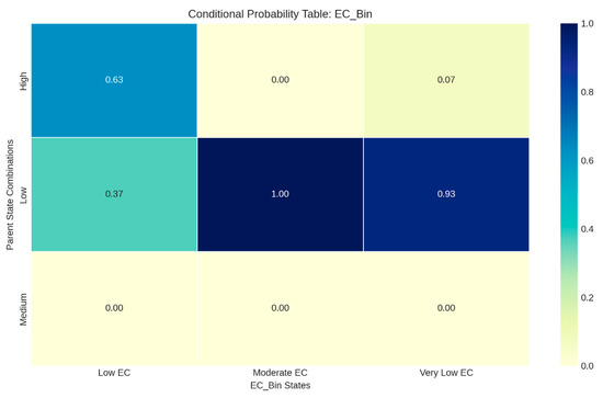 The study used MLE to estimate the CPDs for each node under specific parent node(s). The full dataset was randomly split into 80% for training and 20% for testing to calculate the relative frequencies of the state combinations [55]. A similar approach was also applied to evaluate the surface-water quality of the Qingyi River within a BN model, achieving high accuracy [56].