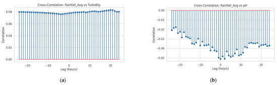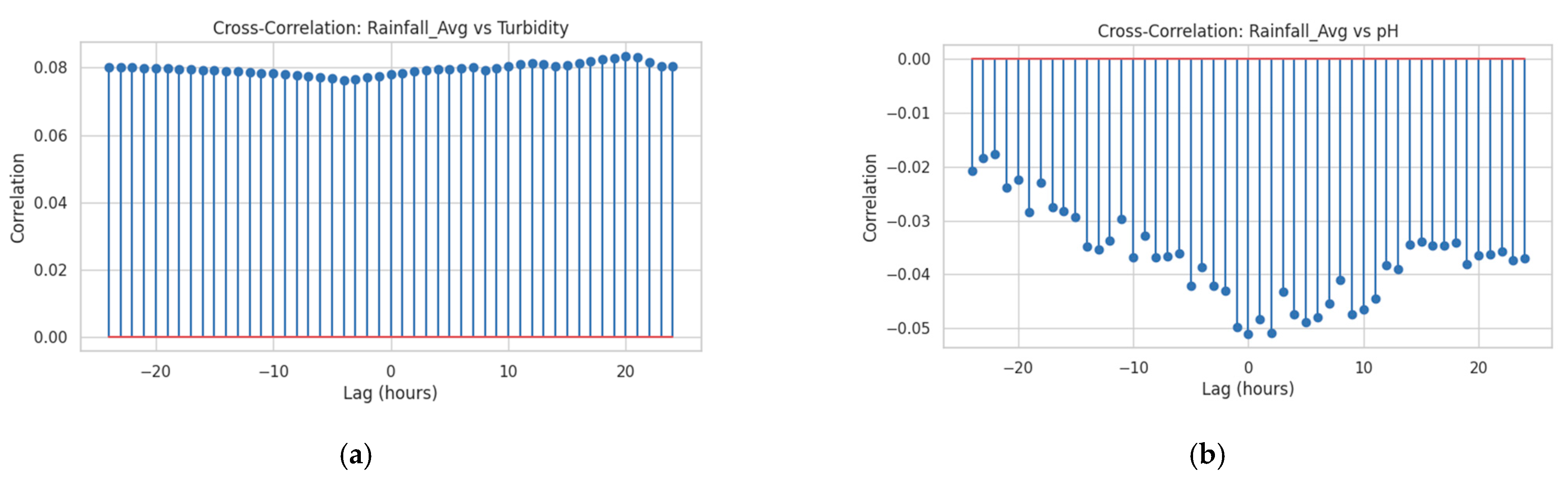Overall, approximately 57% of the modeled water quality parameters showed immediate (0 h lag) responses, while an additional 29–43% exhibited short lags (≤5 h) with weaker correlations, implying minimal delay in system response. Only turbidity displayed a significant lagged response (~20 h after rainfall), indicating the time required for runoff-induced sediment transport to reach the river channel.