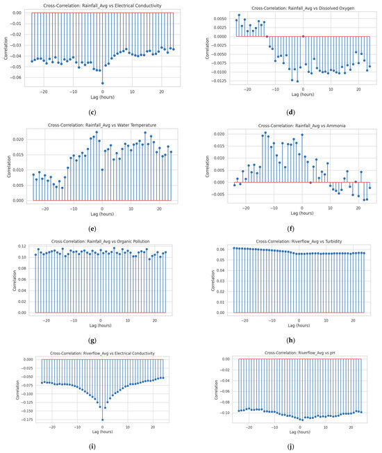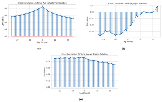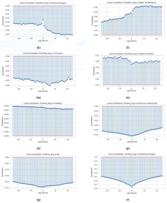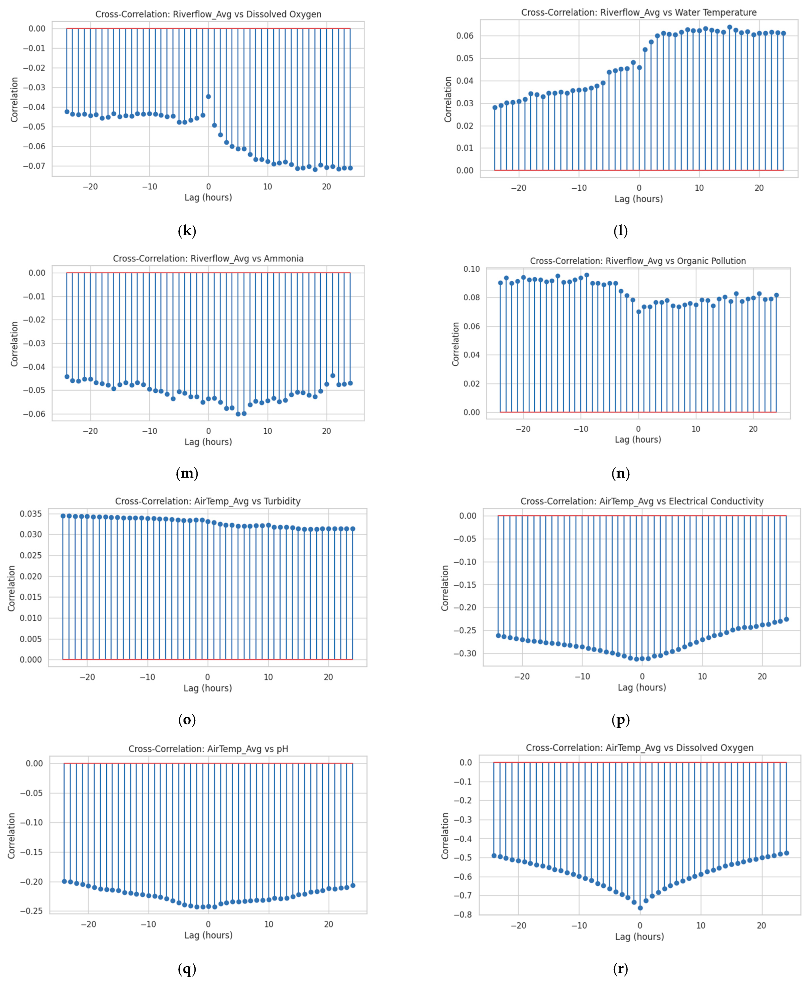 (a) Cross-Correlation Heatmap: Rainfall_Avg vs. Turbidity. (b) Cross-Correlation Heatmap: Rainfall_Avg vs. pH. (c) Cross-Correlation Heatmap: Rainfall_Avg vs. Electrical Conductivity. (d) Cross-Correlation Heatmap: Rainfall_Avg vs. Dissolved Oxygen. (e) Cross-Correlation Heatmap: Rainfall_Avg vs. Water Temperature. (f) Cross-Correlation Heatmap: Rainfall_Avg vs. Ammonia. (g) Cross-Correlation Heatmap: Rainfall_Avg vs. Organic Pollution. (h) Cross-Correlation Heatmap: Riverflow_Avg vs. Turbidity. (i) Cross-Correlation Heatmap: Riverflow_Avg vs. Electrical Conductivity. (j) Cross-Correlation Heatmap: Riverflow_Avg vs. pH. (k) Cross-Correlation Heatmap: Riverflow_Avg vs. Dissolved Oxygen. (l) Cross-Correlation Heatmap: Riverflow_Avg vs. Water Temperature. (m) Cross-Correlation Heatmap: Riverflow_Avg vs. Ammonia. (n) Cross-Correlation Heatmap: Riverflow_Avg vs. Organic Pollution. (o) Cross-Correlation Heatmap: AirTemp_Avg vs. Turbidity. (p) Cross-Correlation Heatmap: AirTemp_Avg vs. Electrical Conductivity. (q) Cross-Correlation Heatmap: AirTemp_Avg vs. pH. (r) Cross-Correlation Heatmap: AirTemp_Avg vs. Dissolved Oxygen. (t) Cross-Correlation Heatmap: AirTemp_Avg vs. Ammonia. (s) Cross-Correlation Heatmap: AirTemp_Avg vs. Water Temperature. (u) Cross-Correlation Heatmap: AirTemp_Avg vs. Organic Pollution. Blue markers represent the cross-correlation coefficient at each time lag, and the red horizontal line indicates zero correlation as a reference baseline.