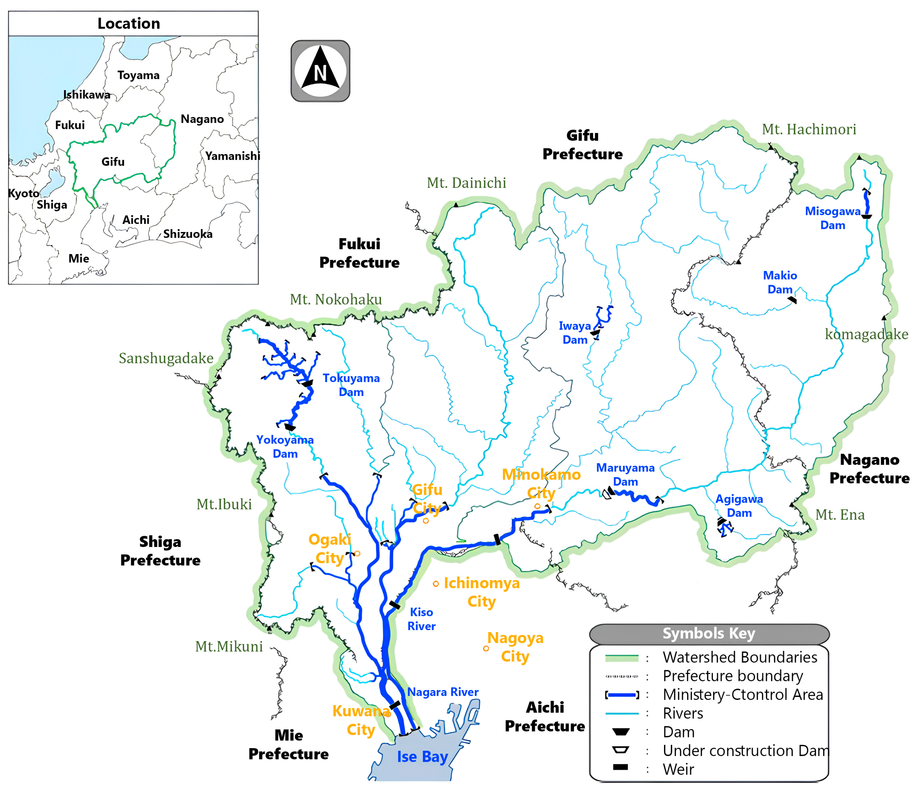 Kiso River Watershed map (sourced for translation from: Ministry of Land, Infrastructure, Transport and Tourism).
