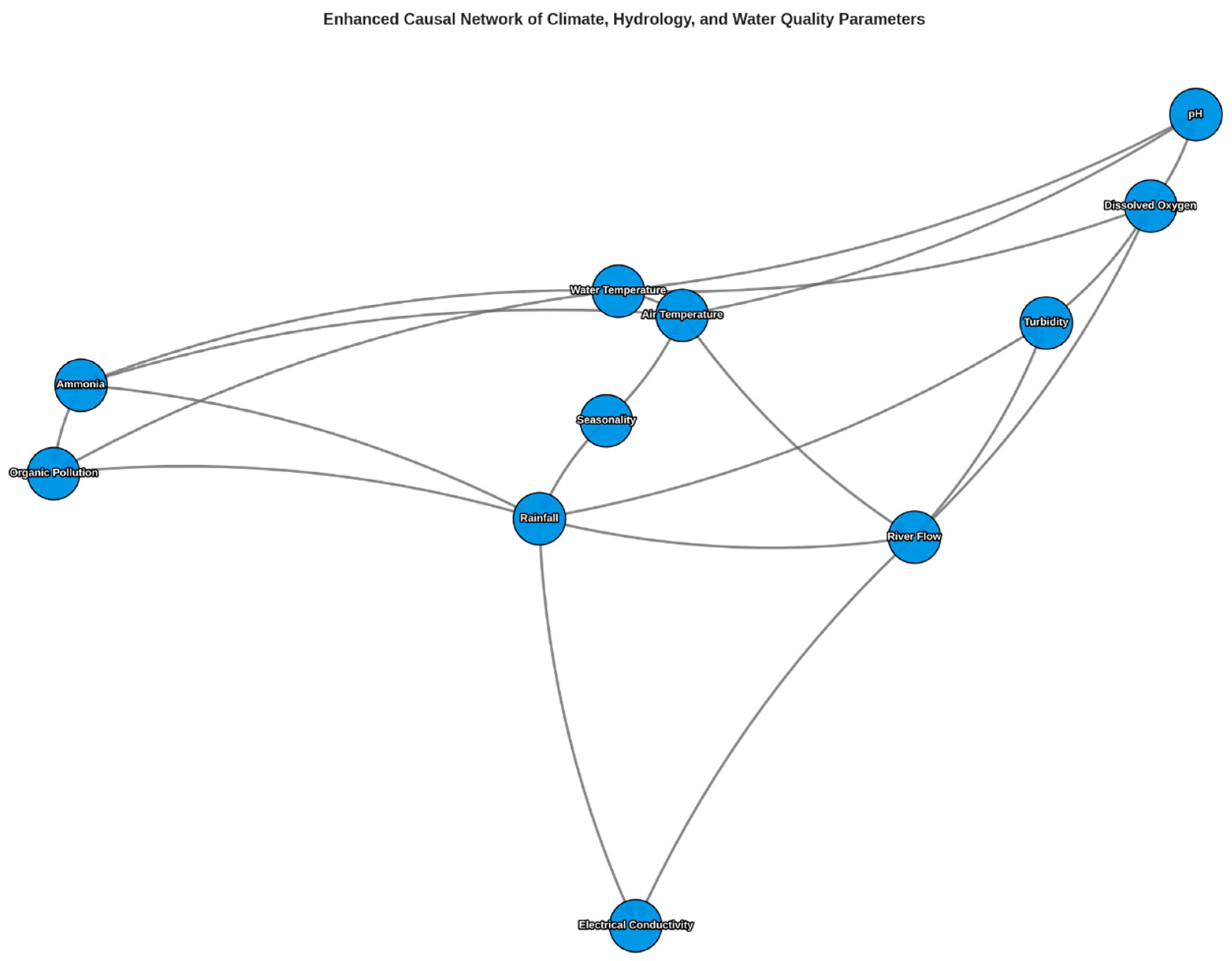 where represent the set of parent nodes of Xi in the DAG. Each variable (Xi) is assigned to a hydrological, climatic, or water quality parameter in the study. Parent–child relationships were defined according to hydrological and ecological processes, which are defined and visualized in Section 3.2.
