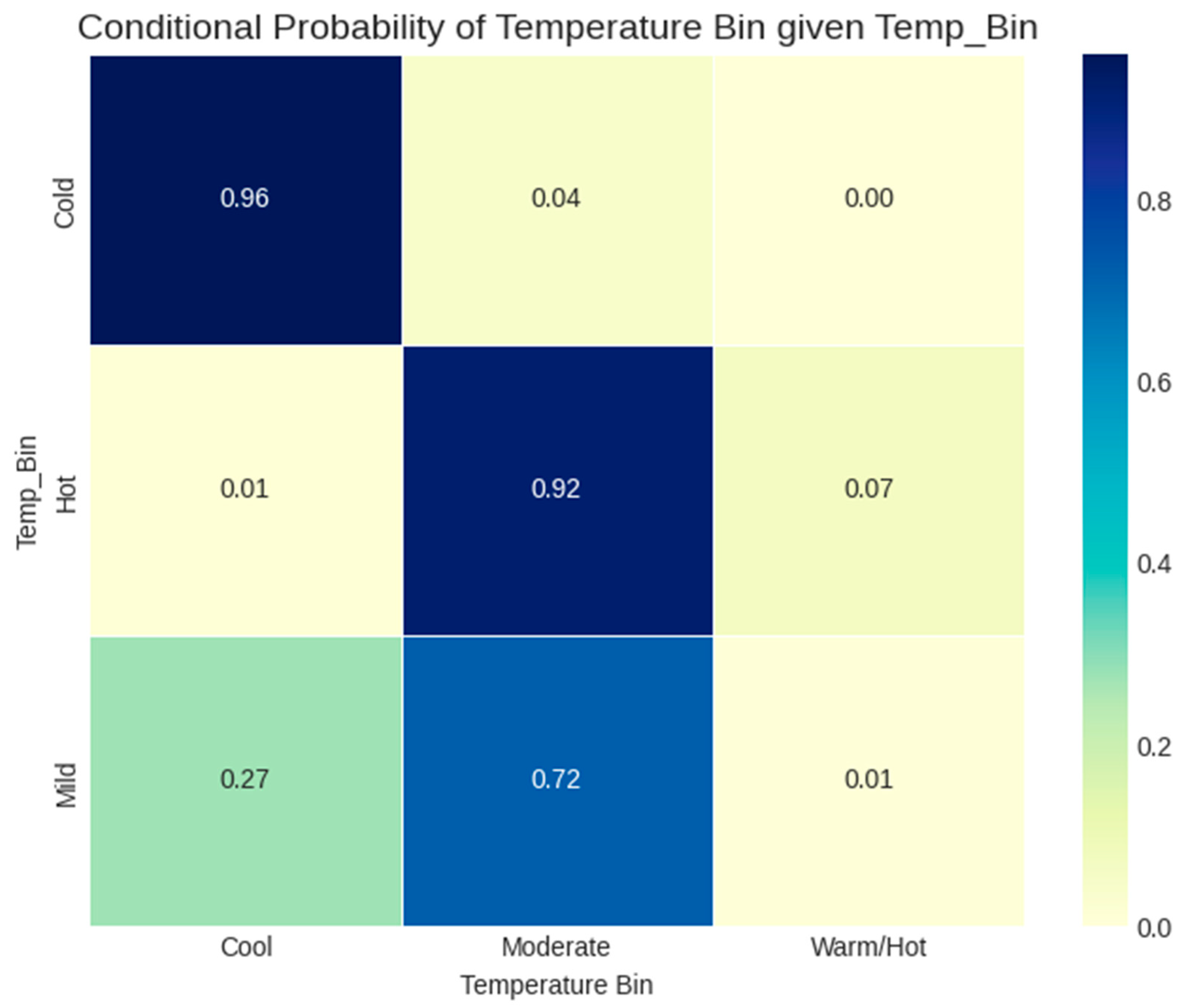 The conditional probability analysis (Figure 4) showed a strong statistical dependence of water temperature on air temperature across different thermal regimes. During colder periods (<15 °C), approximately 96% of water temperature values were classified as low, indicating a pronounced thermal coupling between the atmosphere and the river. This relationship reflects reduced solar radiation and limited convective heat exchange, both of which constrain the energy transfer to the water column. Moderate air temperatures (15–25 °C) corresponded to only 72% moderate water temperatures, likely reflecting transitional seasonal variability, such as changes in solar radiation, cloud cover, and regional winds [58]. High air temperatures (>25 °C) produced mostly moderate water temperatures, highlighting the buffering effect of stable base flows in the Kiso River [59,60,61]. These patterns are consistent with prior studies showing that rivers with regulated or stable flows exhibit reduced thermal sensitivity to ambient air temperature changes.