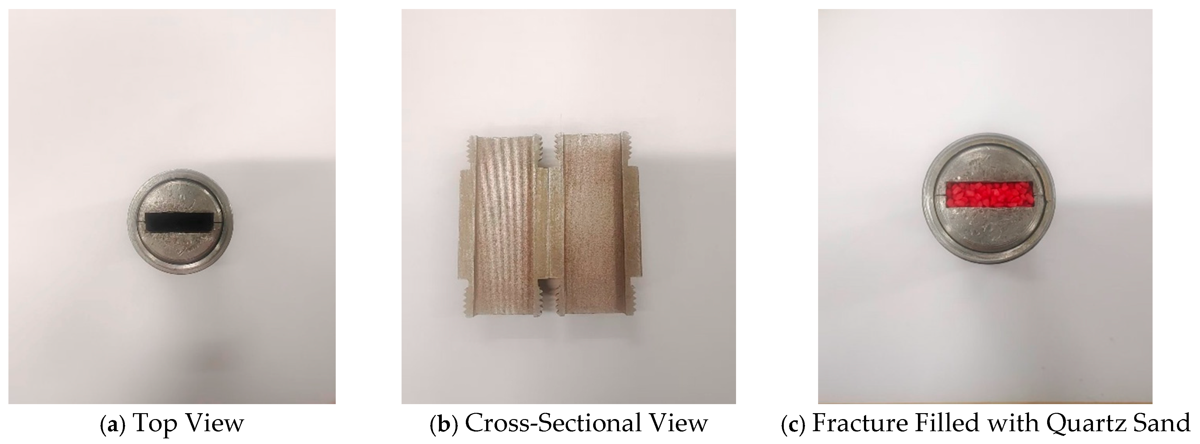 The plugging experiments utilized a standard-sized steel core (d × L = 2.5 cm × 5.0 cm) (Figure 1), featuring a central fracture measuring 17 mm in length × 5 mm in width × 50 mm in height, for proppant placement. The fracture was packed with 20–40-mesh quartz sand, and the end faces were secured using mesh/rubber sleeves.