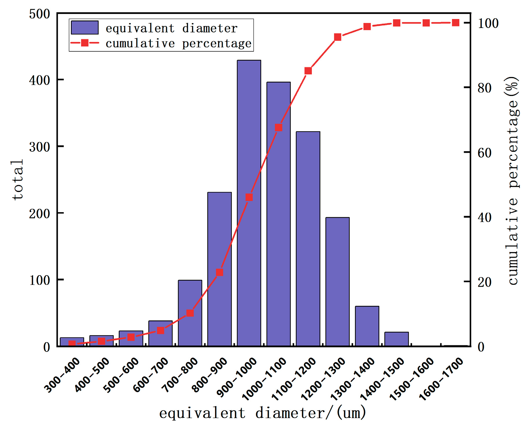 A 3D visualization of the CT scan is shown in Figure 2b. The porosity of the packed region was determined to be 34.5%, providing fundamental parameters for model construction. The pore size distribution characteristics were also obtained, as shown in Figure 3, revealing a maximum pore diameter of 1691.7 μm and an average pore diameter of 1013.47 μm.