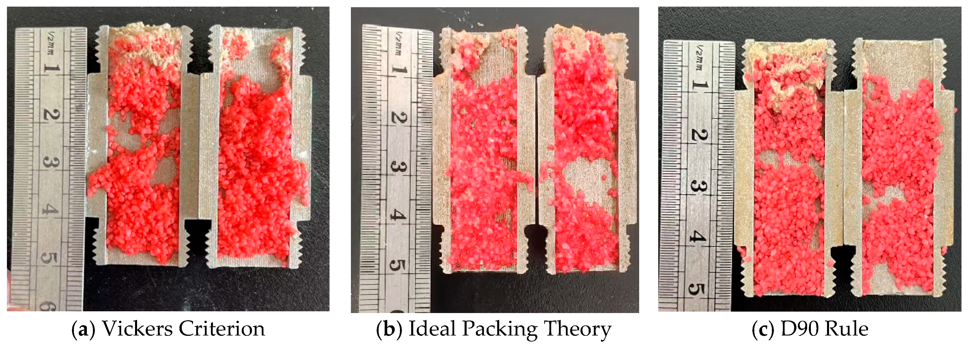 Invasion depth serves as one of the key indicators for evaluating the performance of plugging materials. Typically, a smaller invasion depth indicates stronger plugging capability of the material against pores or fractures, more effectively preventing fluid invasion, thereby enhancing wellbore stability and drilling fluid performance [27,28,29]. The intrusion depths of the Vickers criterion, Ideal Packing Theory, and D90 rule are 0.9 cm, 1.2 cm, and 1.3 cm, respectively. The plugging effects under the three plugging theories are illustrated in Figure 6.