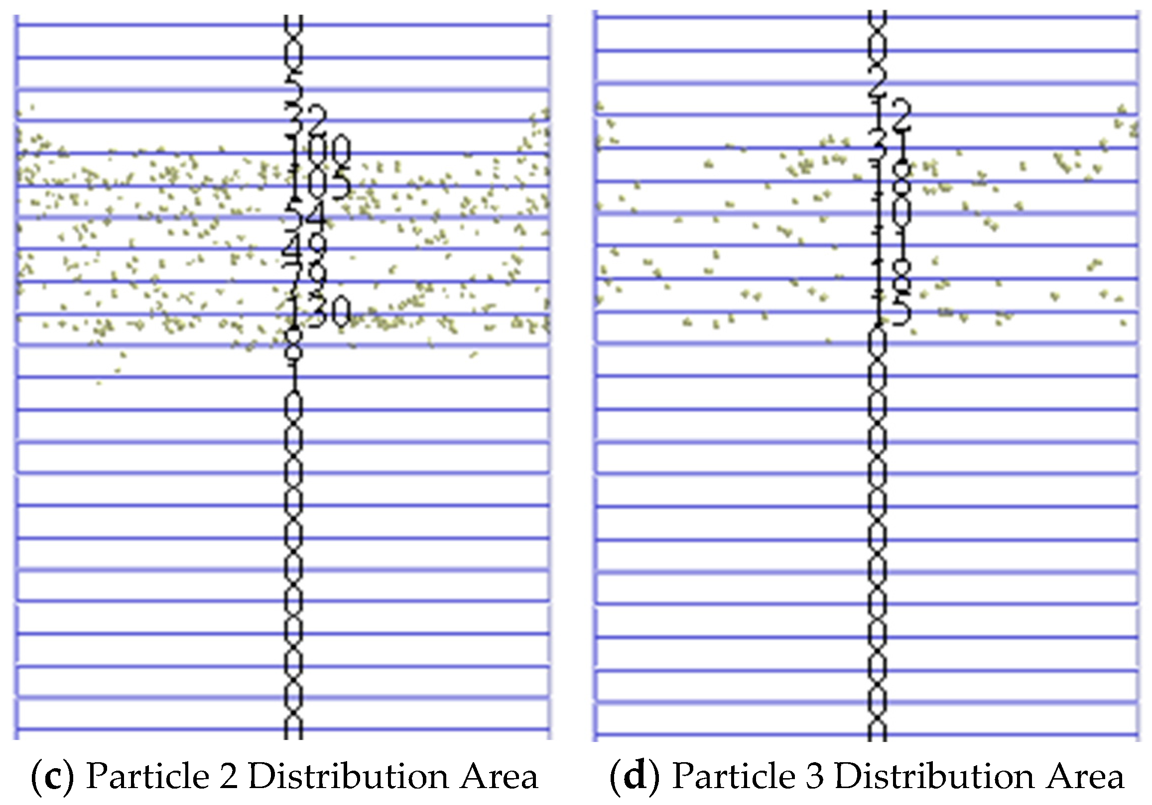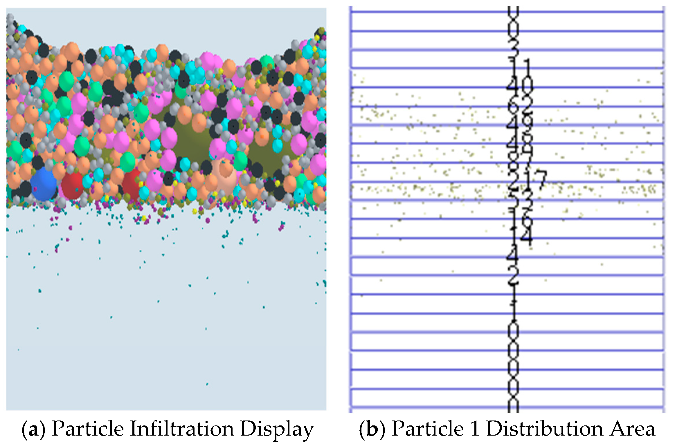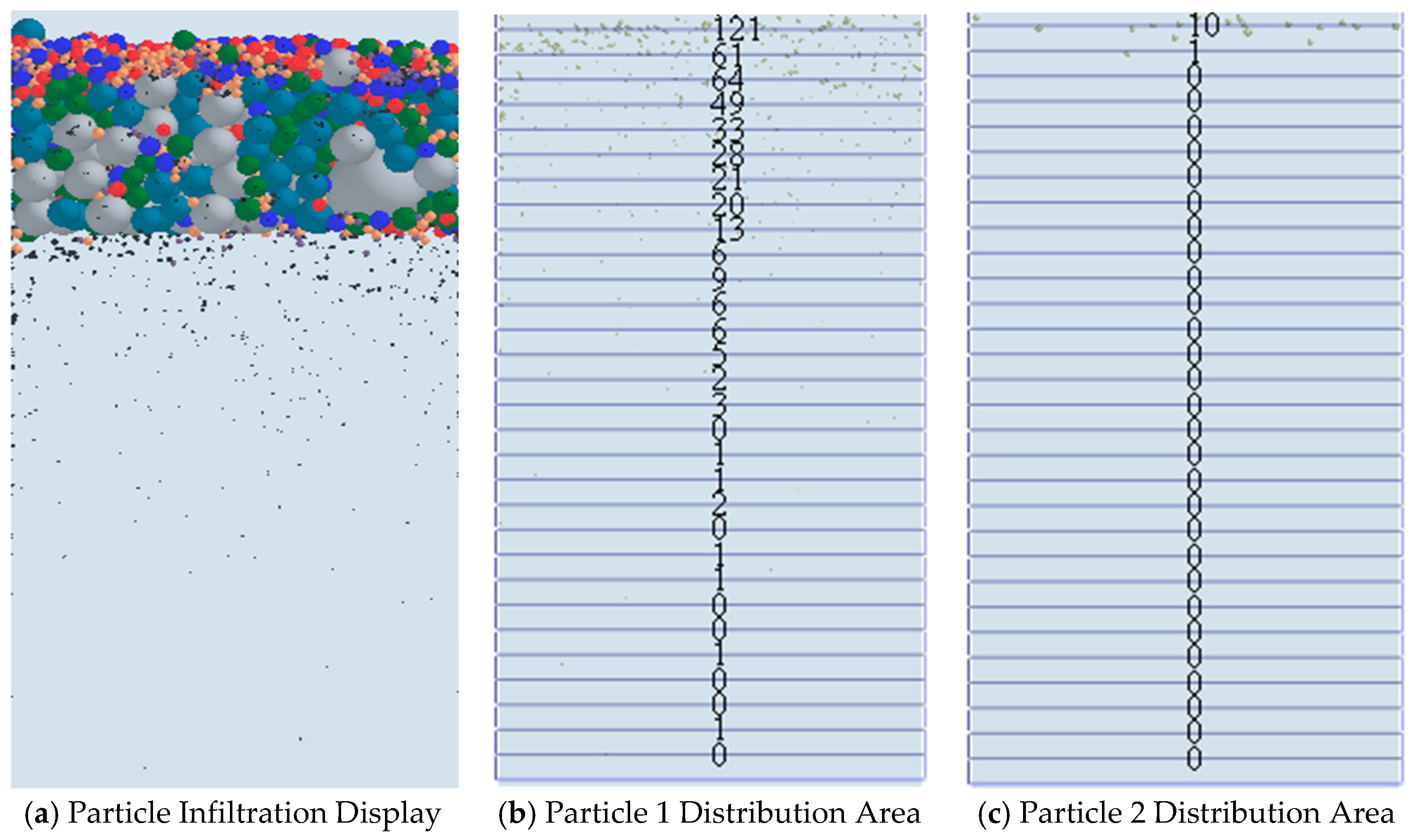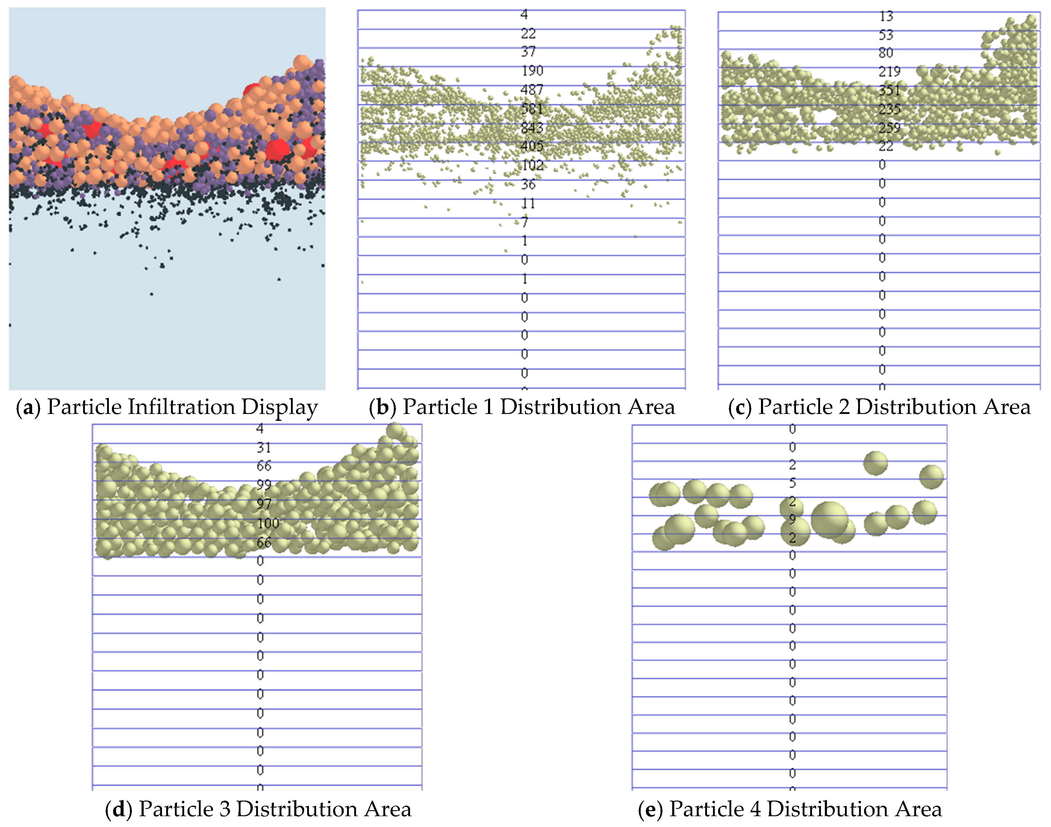 The simulation results based on the Vickers criterion are shown in Figure 7, revealing significant differences in particle infiltration and distribution characteristics. Figure 6a illustrates the distribution changes in particles during the infiltration process, where the upper layer shows dense particle accumulation, while the lower layer appears relatively sparse. This reflects the gradual reduction in particles during infiltration under fluid impact. The numerical values in the figure represent particle aggregation density. Starting from the eighth horizontal line downward, each line represents a depth increment of 1 mm. On this depth scale, Particle 1 demonstrates certain infiltration capability, reaching a depth of 8 mm, indicating that its size characteristics grant it relatively strong mobility within the medium. Particle 2 infiltrates only 1 mm, showing weak infiltration capability and a tendency to accumulate at shallower depths. Particles 3 and 4 show almost no infiltration, indicating that their movement within the medium is significantly hindered, which relates to their larger particle sizes. Combined with the proportional settings of different particle size intervals in the Vickers criterion, the simulation results reveal significant behavioral differences among particles of varying sizes within the medium. By rationally configuring the proportions of particles in different size intervals, the differential infiltration characteristics can be utilized to form an effective plugging structure in the medium. Larger particles preferentially block at shallow depths, while smaller particles partially infiltrate to fill voids, thereby achieving effective medium plugging. This validates the rationality and effectiveness of the Vickers criterion in configuring plugging material particle sizes, providing a theoretical basis for particle size selection and proportioning in practical plugging operations.