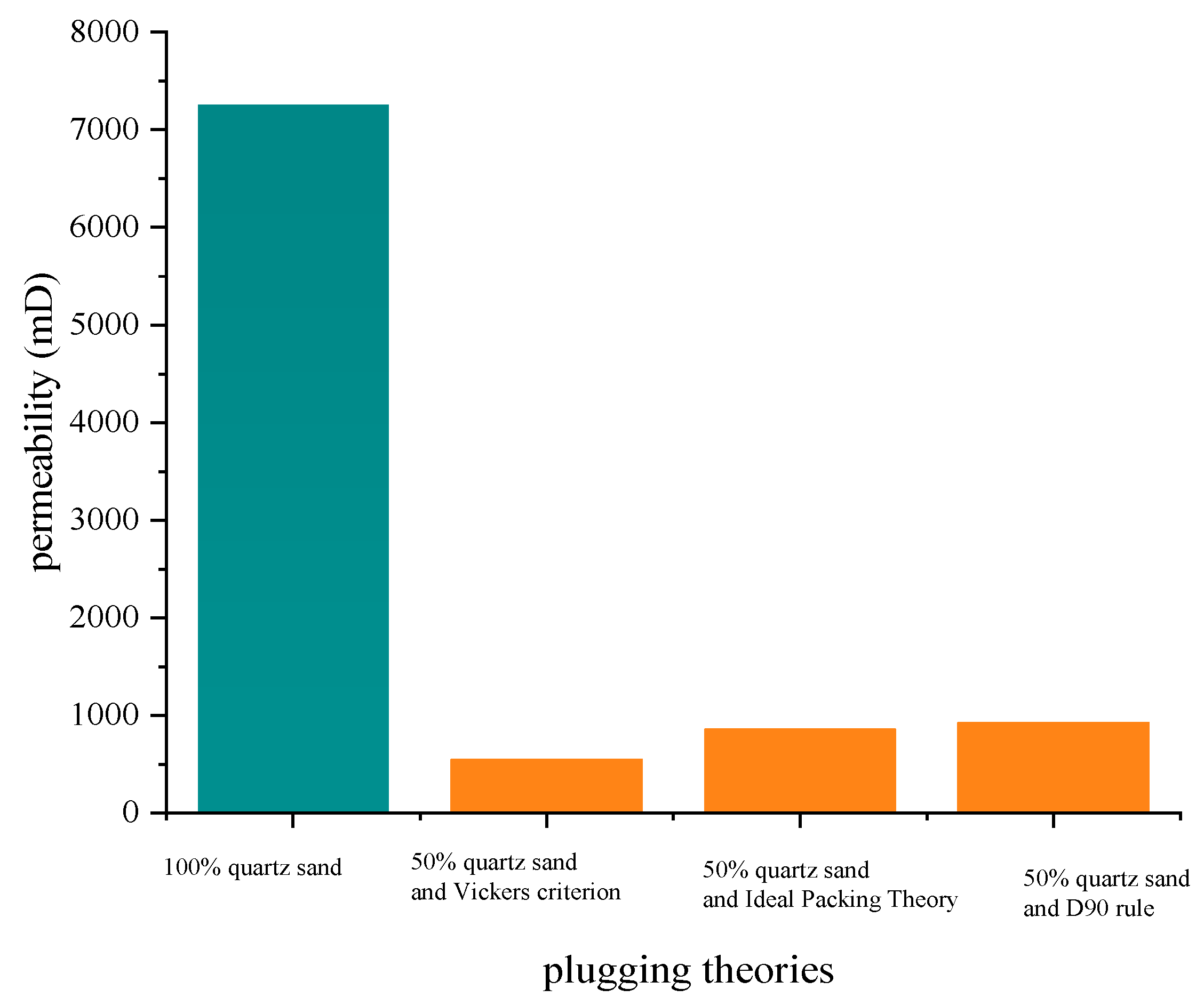 To quantitatively evaluate the plugging effectiveness of the Vickers criterion, Ideal Packing Theory, and D90 rule, this study employed sand-packed-tube displacement experiments to conduct permeability tests on three different plugging particle combinations. The experiments continued to use 20–40-mesh quartz sand to simulate natural fractures. By comparing the rate of permeability change before and after plugging under different theoretical frameworks, the plugging effectiveness (i.e., plugging efficiency) of the three theories on the target formation was evaluated, thereby identifying the optimal plugging theory compatible with the formation characteristics.