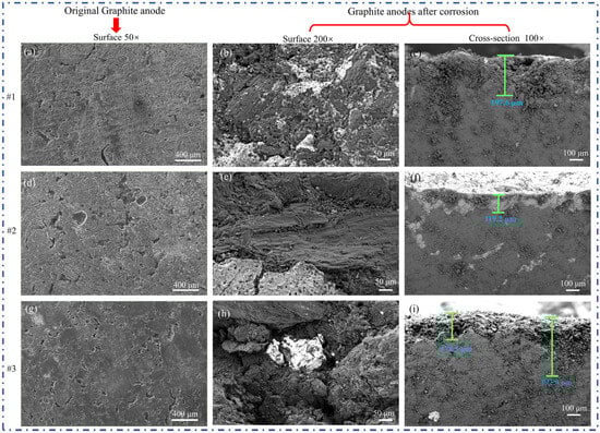 The surface and cross-sectional morphologies of the graphite anodes before and after corrosion were characterized by SEM. Figure 2 presents comparative microstructural features of the three anodes, including pre corrosion surface views at 50×, postcorrosion surface views at 200× and 5000×, and cross-sectional views at 100× after exposure.