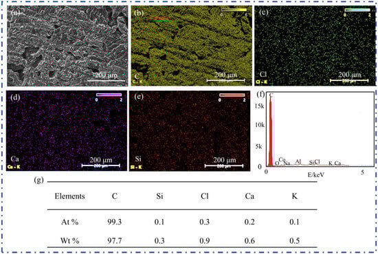 The surface elemental composition of the graphite anode before corrosion: (a) SEM image of the local topography; (b) distribution map of C; (c) distribution map of Cl; (d) distribution map of Ca; (e) distribution map of Si; (f) distribution map of elements; (g) distribution table of elements.