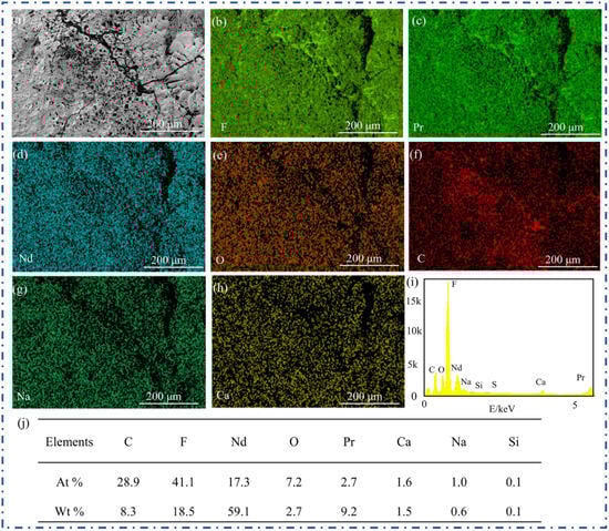 The surface elemental composition of the graphite anode after corrosion: (a) SEM image of the local topography; (b) distribution map of F; (c) distribution map of Pr; (d) distribution map of Nd; (e) distribution map of O; (f) distribution map of C; (g) distribution map of Na; (h) distribution map of Ca; (i) relative distribution contents of various elements; (j) distribution table of elements.