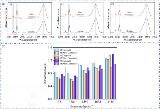 Figure 7a,b clearly shows a consistent attenuation of the infrared absorption peaks at 1351, 1384, 1590, 1632, and 3435 cm−1 across all three types of graphite anodes after corrosion in the fluoride molten salt environment. These spectral changes provide direct evidence of microstructural and chemical transformations resulting from the combined effects of high temperature, molten salt infiltration, and fluoride-ion attack. A detailed interpretation of these spectral changes, organized by wavenumber region, is presented below.
