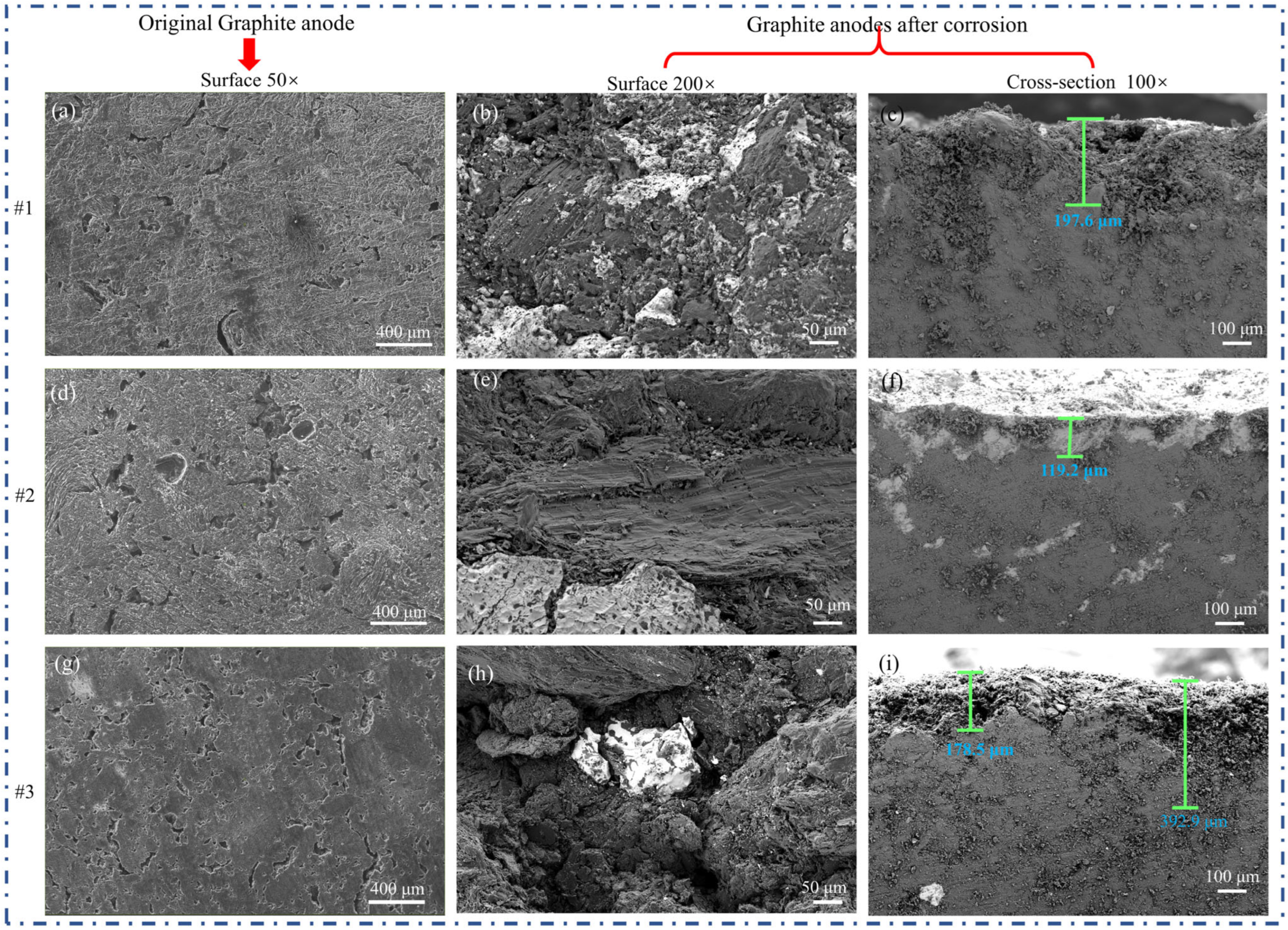 The surface and cross-sectional morphologies of the graphite anodes before and after corrosion were characterized by SEM.