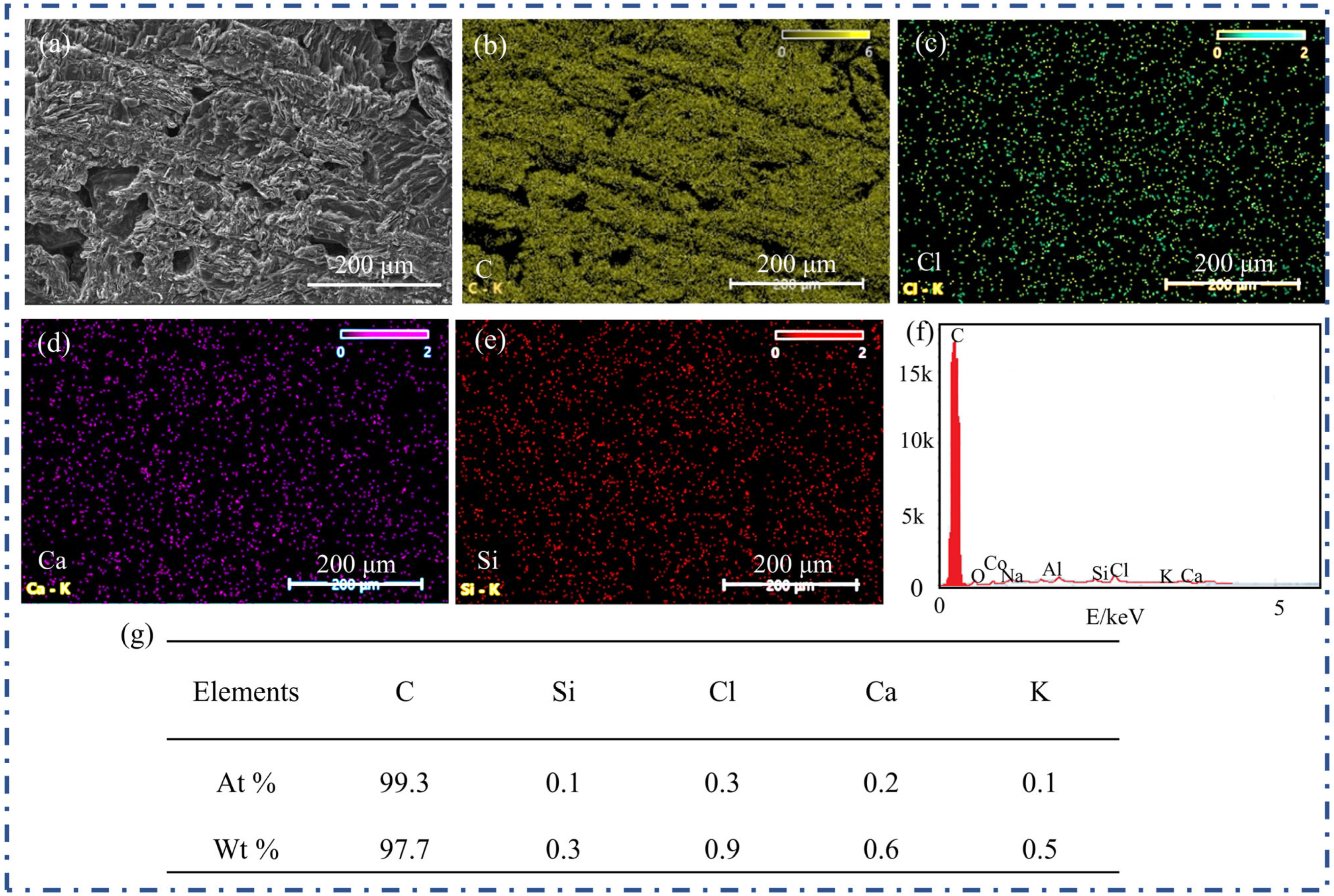 Figure 3d,e quantitatively summarizes the relative content of each element: carbon constitutes the vast majority, whereas other elements—such as Si, Cl, K, and Ca—are present in extremely low quantities.