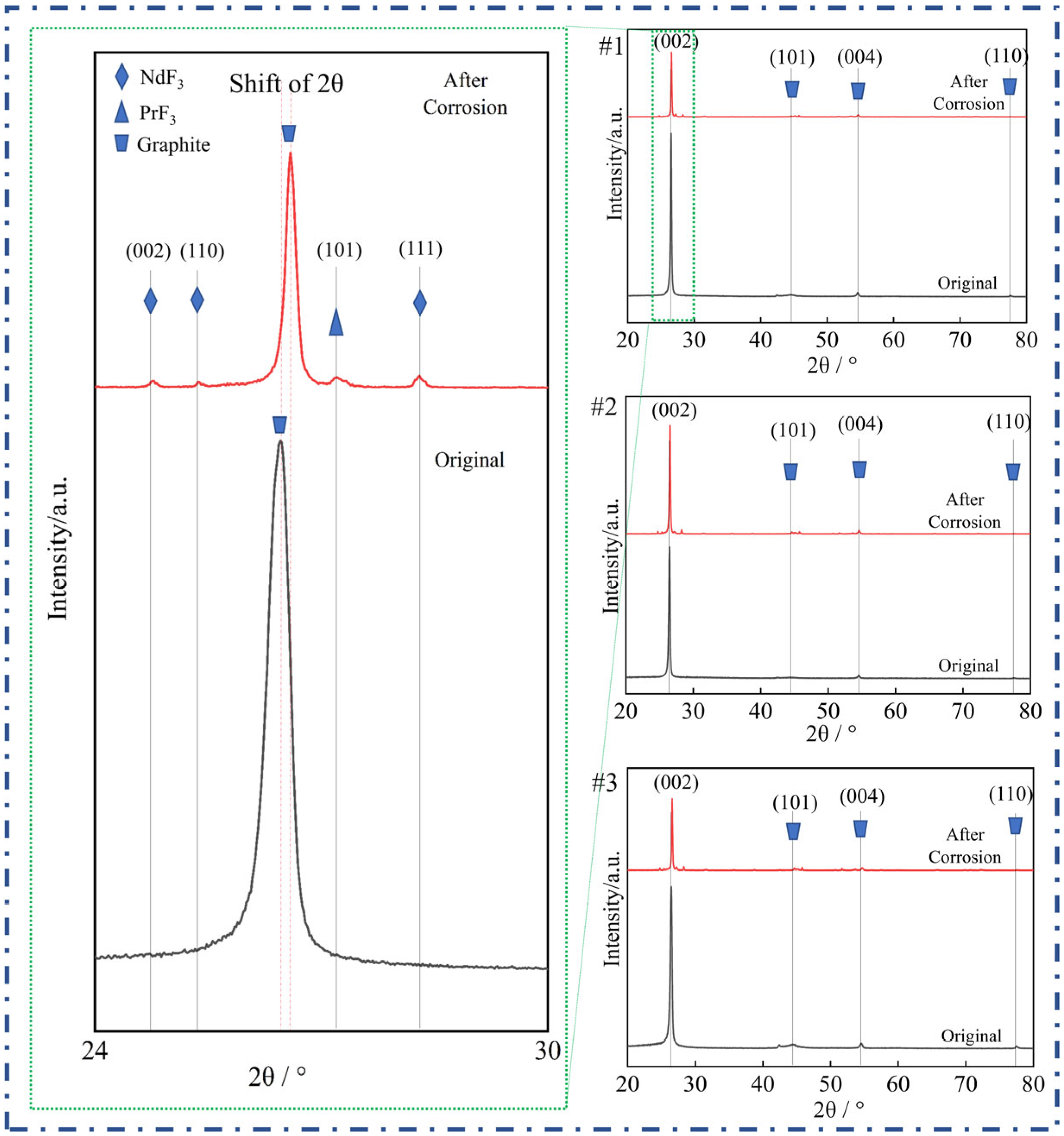 In addition to the attenuation of the graphite peaks, new diffraction features emerge in the corroded samples. Specifically, characteristic peaks corresponding to PrF3 and NdF3 are observed, indicating the formation of these rare earth fluorides. For NdF3, peaks corresponding to the (002), (110), and (111) planes are identified, whereas for PrF3, the (101) plane is detected (as labeled in the left-hand detailed view and the right-hand subfigures).