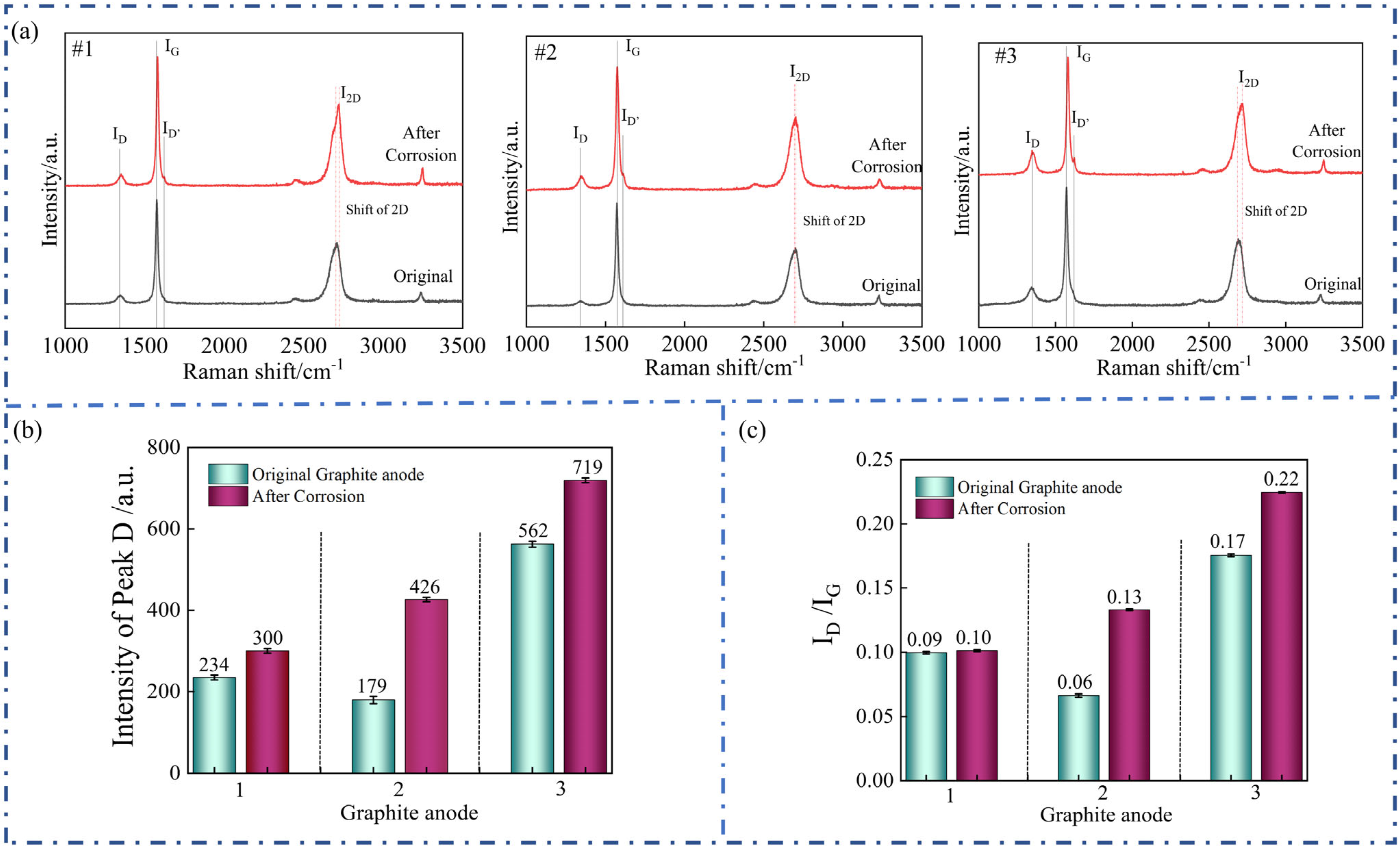 The first-order Raman spectrum provides critical insights into the in-plane structural integrity of graphite. Before corrosion, the G band of the graphite anode was located at 1581.8–1582.2 cm