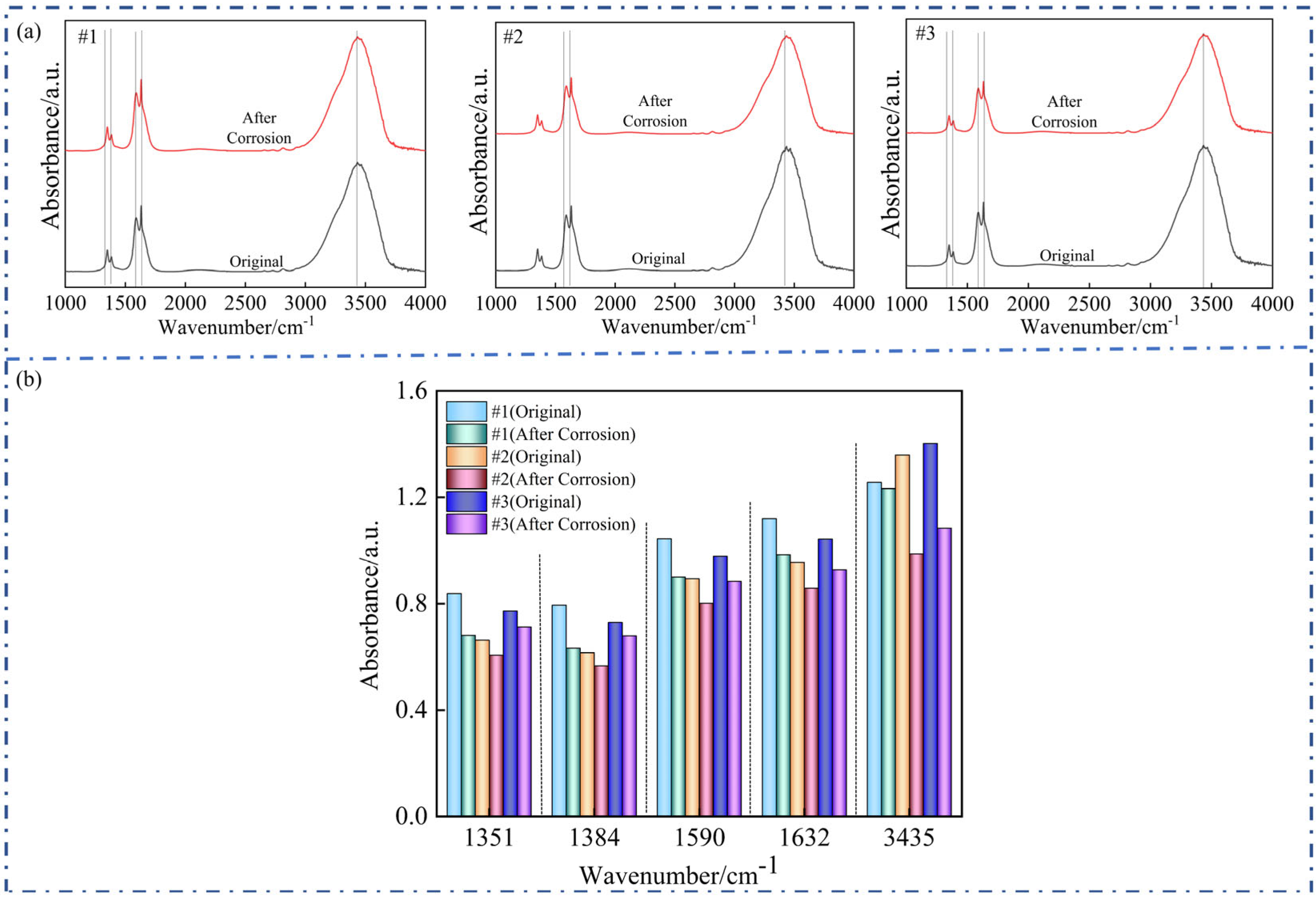 Figure 7a,b clearly shows a consistent attenuation of the infrared absorption peaks at 1351, 1384, 1590, 1632, and 3435 cm