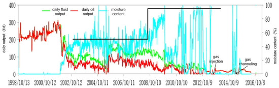 In the early stages of the Tarim oilfield’s development, water flooding was the primary method used; however, as the water injection period increased, the water cut rose, and oil production declined. Subsequently, nitrogen injection was implemented to recover the remaining oil, but owing to pronounced reservoir heterogeneity and large fluid mobility contrast, injected gas easily established preferential flow pathways, causing gas coning and resulting in only a marginal enhancement of recovery. The gas injection production curve is shown in Figure 1.