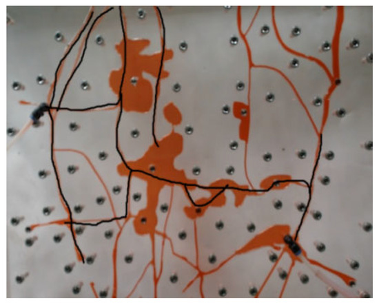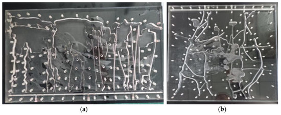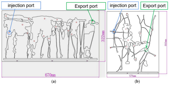 Considering the representative fracture structures and vug–fracture assemblages of the Tarim oilfield, a two-dimensional visualization model of a fractured-vuggy system was designed and constructed following a set of similarity criteria, as illustrated in Figure 2 and Figure 3. Guided by the principle of flow similarity, the fluid mobility under experimental conditions was ensured to be essentially similar to that under reservoir conditions. After calculations, the fracture aperture in the model was designed to range from 0.5 to 2 mm. The vertical model, representing the reservoir’s longitudinal section, measures 670 × 322 mm with a total volume of 880 mL, while the horizontal (transverse) model has dimensions of 576 × 660 mm and a total volume of 780 mL. The physical model was fabricated from acrylic sheets, comprising an etched flow plate and a sealing cover plate. Due to the relatively low compressive strength of acrylic plates, the experiment was conducted under normal pressure. Similar criteria were used to convert the experimental parameters in order to simulate the actual reservoir.