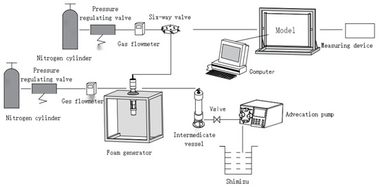 The experimental parameters were established according to similarity principles to ensure that the test results closely reflected the behavior observed under actual reservoir conditions. The water employed in the fractured-vuggy visualization experiments was a self-prepared synthetic formation brine, possessing a total salinity of about 2.2 × 105 mg/L and containing approximately 1 × 104 mg/L of calcium and magnesium ions. This brine represents a high-salinity CaCl2-type solution, which was colored with methyl blue dye for visual observation. The experimental oil is stained using Sudan III reagent. The injection method is a single injection followed by a single production. All experiments were performed at a controlled ambient temperature of 25 °C. The primary experimental measurement focused on quantifying the displaced oil volume. Foam was prepared by combining nitrogen gas, foaming and stabilizing agents, and the synthetic formation water through a foam generation unit. As illustrated in Figure 4, the overall experimental apparatus comprised three subsystems: the fractured-vuggy visualization model assembly, the experimental control module, and the video monitoring and data acquisition unit. The visualization system for the fractured-vuggy model included a supporting frame and the transparent model itself. The experimental control system includes a displacement pump (liquid flow rate 0.01 to 9.99 mL/min), nitrogen gas cylinder, six-way valve, intermediate container (maximum pressure tolerance 50 MPa), gas flow meter, and foam generator. The video monitoring and data acquisition system includes a computer with image processing software (2018 version), a produced fluid metering device, and a high-definition camera (maximum resolution 1080p).