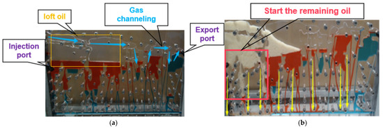 (1) Density difference, gravity impact, and displacement of loft oil (oil located at the upper section of the formation) [10]: In vertically stratified reservoirs, the notable density contrast causes gas to accumulate at the top due to gravity segregation, creating an “oil cap” that helps recover high-pressure crude oil, often called “balcony oil.” However, a large disparity in flow velocities exists between gas and oil phases. The high mobility of gas results in viscous fingering and preferential gas migration paths (Figure 5a), which reduce displacement efficiency and cause considerable residual oil to remain centrally. Subsequently, foam-assisted gas displacement technology was introduced. Due to its lower density, the foam system accumulates in the central area of the reservoir under the influence of gravity, increasing the gas sweep volume. At the same time, the presence of foam enhances the apparent viscosity of the displacement phase, slows down gas surging, and enables the effective exploitation of the remaining oil in the central area, as shown in Figure 5b.