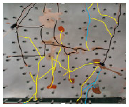 (2) Gas diffusion and flow path selection [10]: In the horizontal fracture model, gas displacement demonstrates a pronounced path preference. Driven by pressure gradients, the gas tends to move along the route offering the least resistance, rapidly passing through the model and creating a primary flow channel. During the early displacement phase, the gas initially pushes out residual oil located near the model’s surface. This process is mainly controlled by interfacial tension and displacement pressure. As the displacement progresses, the gas gradually invades the internal fracture network of the model. Its migration behavior is strictly controlled by the fracture structure: the gas first enters the main trunk fractures with larger openings and better connectivity; subsequently, under the action of the pressure gradient, it successively enters the secondary fractures with lower curvatures and smaller tortuosity, thereby exploiting the remaining oil in the internal multi-scale fracture network. The migration path and the dynamic evolution process of the displacement front are represented by the black line in Figure 6. With the ongoing rise in gas injection volume, the gas progressively forms a continuous flow channel within the fracture network, directing flow toward the production outlet. Eventually, the gas prematurely breaks through to the bottom of the production well, resulting in gas coning. This phenomenon greatly decreases gas sweep efficiency and oil recovery effectiveness, while causing a substantial rise in the produced gas–oil ratio, which severely impacts the economic feasibility of the project. This phenomenon reveals that when implementing gas flooding in fractured reservoirs, controlling flow rate and adjusting the suction profile are crucial for improving recovery rate.