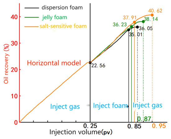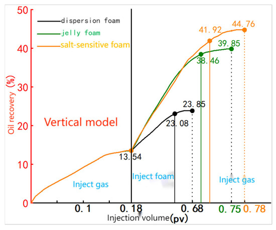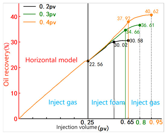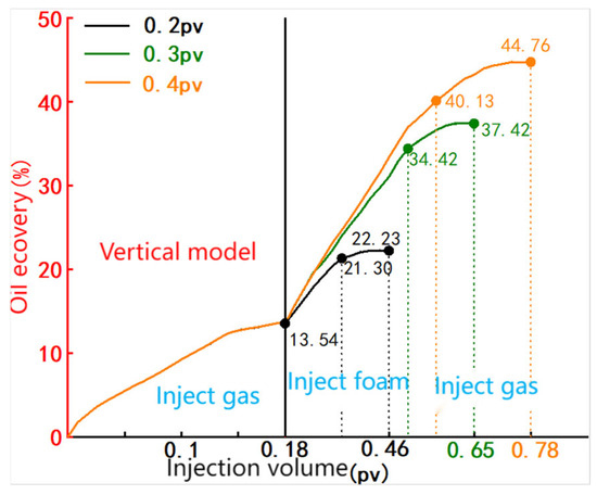 The study evaluated the oil displacement performance of varying injection volumes of salt-sensitive foam at a gas–liquid ratio of 2:1 during the gas coning stage. Results are presented in Table 5 and Figure 12.